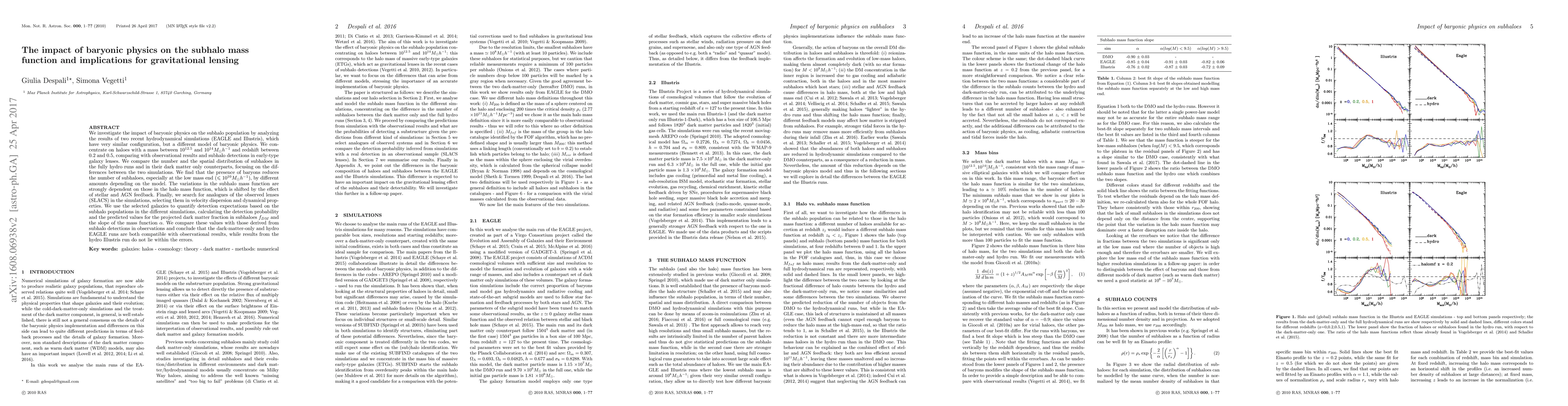 We investigate the impact of baryonic physics on the subhalo population by analyzing the results of two recent hydrodynamical simulations (EAGLE and Illustris), which have very similar configuration, but a different model of baryonic physics. We concentrate on haloes with a mass between $10^{12.5}$ and $10^{14}M_{\odot}h^{-1}$ and redshift between 0.2 and 0.5, comparing with observational results and subhalo detections in early-type galaxy lenses. We compare the number and the spatial distribution of subhaloes in the fully hydro runs and in their dark matter only counterparts, focusing on the differences between the two simulations. We find that the presence of baryons reduces the number of subhaloes, especially at the low mass end ($\leq 10^{10}M_{\odot}h^{-1}$), by different amounts depending on the model. The variations in the subhalo mass function are strongly dependent on those in the halo mass function, which is shifted by the effect of stellar and AGN feedback. Finally, we search for analogues of the observed lenses (SLACS) in the simulations, selecting them in velocity dispersion and dynamical properties. We use the selected galaxies to quantify detection expectations based on the subhalo populations in the different simulations, calculating the detection probability and the predicted values for the projected dark matter fraction in subhaloes $f_{DM}$ and the slope of the mass function $\alpha$. We compare these values with those derived from subhalo detections in observations and conclude that the dark-matter-only and hydro EAGLE runs are both compatible with observational results, while results from the hydro Illustris run do not lie within the errors.