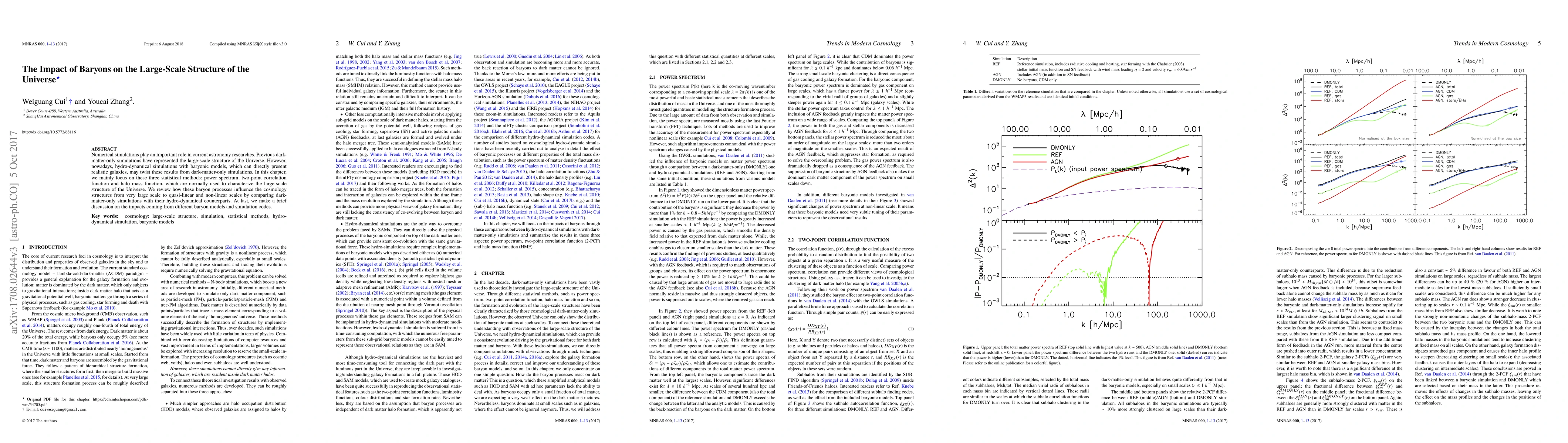 Numerical simulations play an important role in current astronomy researches. Previous dark-matter-only simulations have represented the large-scale structure of the Universe. However, nowadays, hydro-dynamical simulations with baryonic models, which can directly present realistic galaxies, may twist these results from dark-matter-only simulations. In this chapter, we mainly focus on these three statistical methods: power spectrum, two-point correlation function and halo mass function, which are normally used to characterize the large-scale structure of the Universe. We review how these baryon processes influence the cosmology structures from very large scale to quasi-linear and non-linear scales by comparing dark-matter-only simulations with their hydro-dynamical counterparts. At last, we make a brief discussion on the impacts coming from different baryon models and simulation codes.