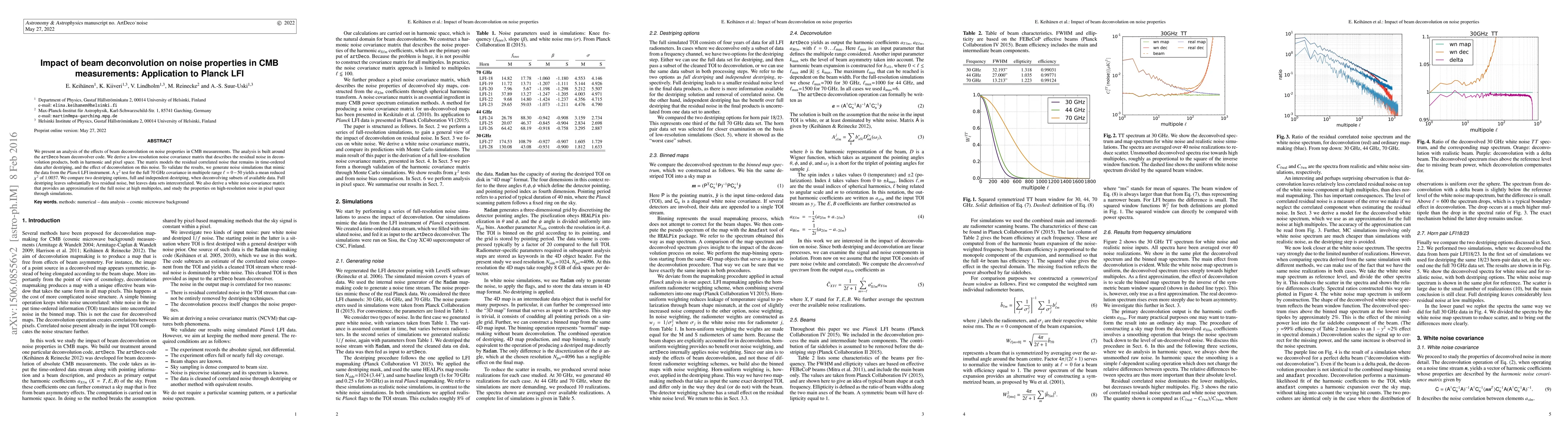 This paper analyzes the impact of beam deconvolution on noise properties in CMB measurements using the Planck LFI instrument, employing the artDeco deconvolver code. It derives a low-resolution noise covariance matrix to model residual noise after deconvolution, and validates the results with Planck LFI simulations, showing that full destriping reduces residual noise but intercorrelates data sets.