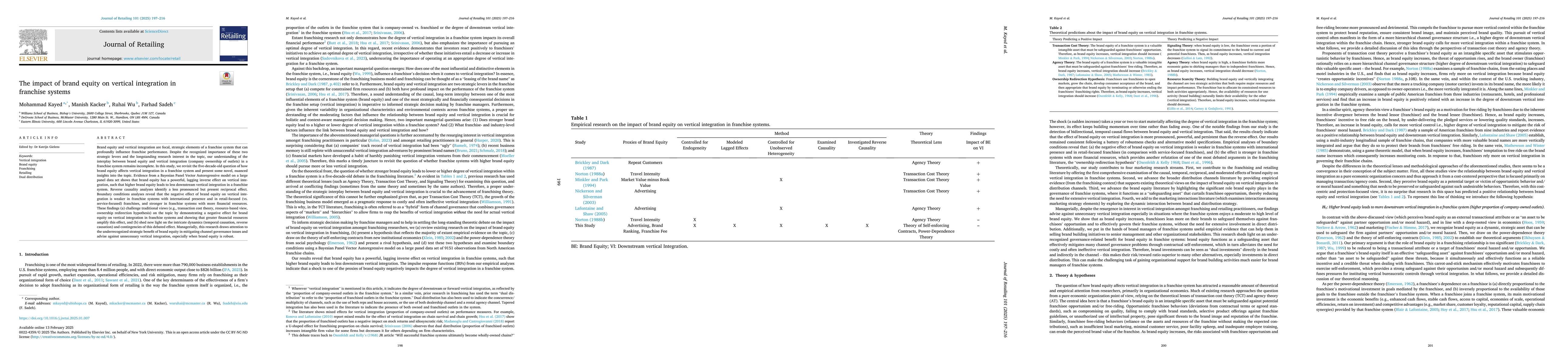 Brand equity and vertical integration are focal, strategic elements of a franchise system that can profoundly influence franchise performance. Despite the recognized importance of these two strategic levers and the longstanding research interest in the topic, our understanding of the interplay between brand equity and vertical integration (company ownership of outlets) in a franchise system remains incomplete. In this study, we revisit the five-decade-old question of how brand equity affects vertical integration in a franchise system and present some novel, nuanced insights into the topic. Evidence from a Bayesian Panel Vector Autoregressive model on a large panel data set shows that brand equity has a powerful, lagging inverse effect on vertical integration, such that higher brand equity leads to less downstream vertical integration in a franchise system. Reverse causality analyses identify a less pronounced but present reciprocal effect. Boundary conditions analyses reveal that the negative effect of brand equity on vertical integration is weaker in franchise systems with international presence and in retail-focused (vs. service-focused) franchises, and stronger in franchise systems with more financial resources. These findings (a) challenge traditional views (e.g., transaction cost theory, resource-based view, ownership redirection hypothesis) on the topic by demonstrating a negative effect for brand equity on vertical integration in franchise systems and showing that greater financial resources amplify this effect, and (b) shed new light on the intricate dynamics (temporal causation, reverse causation) and contingencies of this debated effect. Managerially, this research draws attention to the underrecognized strategic benefit of brand equity in mitigating channel governance issues and advise against unnecessary vertical integration, especially when brand equity is robust.
