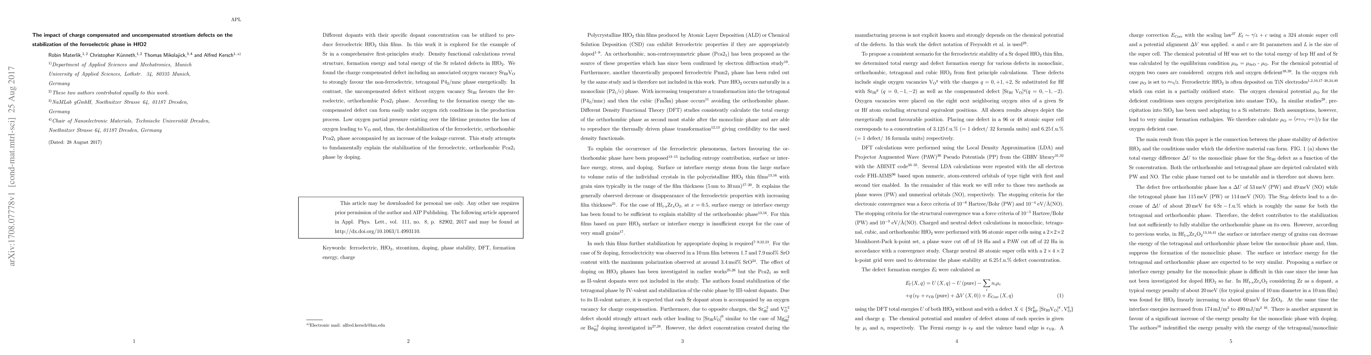 Different dopants with their specific dopant concentration can be utilized to produce ferroelectric HfO$_2$ thin films. In this work it is explored for the example of Sr in a comprehensive first-principles study. Density functional calculations reveal structure, formation energy and total energy of the Sr related defects in HfO$_2$. We found the charge compensated defect including an associated oxygen vacancy Sr$_\text{Hf}$V$_\text{O}$ to strongly favour the non-ferroelectric, tetragonal P4$_\text{2}$/mnc phase energetically. In contrast, the uncompensated defect without oxygen vacancy Sr$_\text{Hf}$ favours the ferroelectric, orthorhombic Pca2$_\text{1}$ phase. According to the formation energy the uncompensated defect can form easily under oxygen rich conditions in the production process. Low oxygen partial pressure existing over the lifetime promotes the loss of oxygen leading to V$_\text{O}$ and, thus, the destabilization of the ferroelectric, orthorhombic Pca2$_\text{1}$ phase accompanied by an increase of the leakage current. This study attempts to fundamentally explain the stabilization of the ferroelectric, orthorhombic Pca2$_\text{1}$ phase by doping.