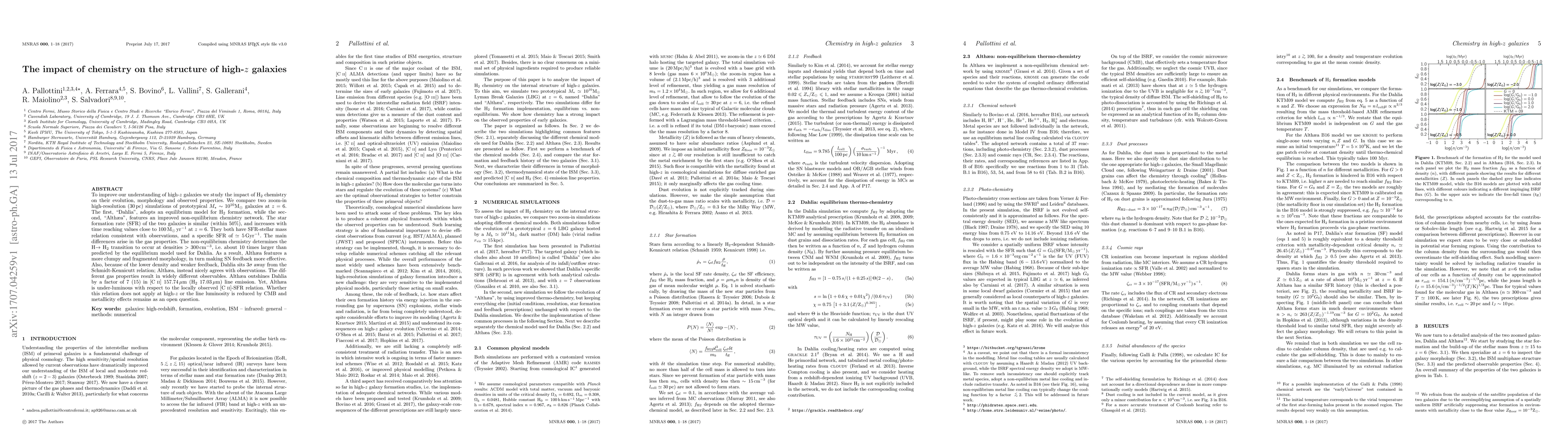 To improve our understanding of high-z galaxies we study the impact of H$_{2}$ chemistry on their evolution, morphology and observed properties. We compare two zoom-in high-resolution (30 pc) simulations of prototypical $M_{\star}\sim 10^{10} {\rm M}_{\odot}$ galaxies at $z=6$. The first, "Dahlia", adopts an equilibrium model for H$_{2}$ formation, while the second, "Alth{\ae}a", features an improved non-equilibrium chemistry network. The star formation rate (SFR) of the two galaxies is similar (within 50\%), and increases with time reaching values close to 100 ${\rm M}_{\odot}/\rm yr$ at $z=6$. They both have SFR-stellar mass relation consistent with observations, and a specific SFR of $\simeq 5\, {\rm Gyr}^{-1}$. The main differences arise in the gas properties. The non-equilibrium chemistry determines the H$\rightarrow$ H$_{2}$~transition to occur at densities $> 300\,{cm}^{-3}$, i.e. about 10 times larger than predicted by the equilibrium model used for Dahlia. As a result, Alth{\ae}a features a more clumpy and fragmented morphology, in turn making SN feedback more effective. Also, because of the lower density and weaker feedback, Dahlia sits $3\sigma$ away from the Schmidt-Kennicutt relation; Alth{\ae}a, instead nicely agrees with observations. The different gas properties result in widely different observables. Alth{\ae}a outshines Dahlia by a factor of 7 (15) in [CII]~$157.74\,\mu{\rm m}$ (H$_{2}$~$17.03\,\mu{\rm m}$) line emission. Yet, Alth{\ae}a is under-luminous with respect to the locally observed [CII]-SFR relation. Whether this relation does not apply at high-z or the line luminosity is reduced by CMB and metallicity effects remains as an open question.