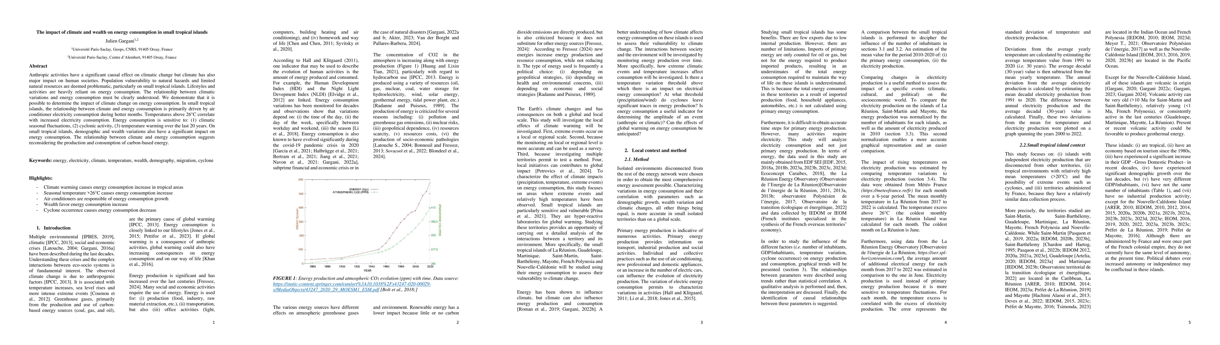 This study investigates the interplay between climate change and energy consumption on small tropical islands, finding that rising temperatures significantly boost air conditioner use. Wealth and demographic factors also influence energy consumption patterns, suggesting a need for rethinking carbon-based energy production and consumption.