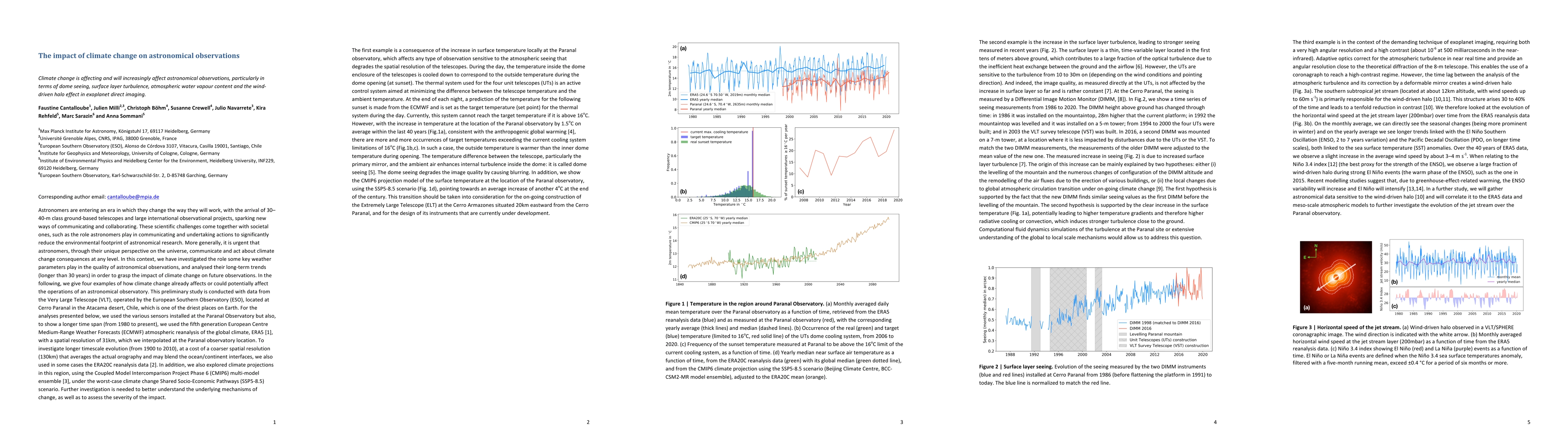 Climate change is affecting and will increasingly affect astronomical observations. In this paper, we investigated the role some key weather parameters play in the quality of astronomical observations, and analysed their long-term trends (longer than 30 years) in order to grasp the impact of climate change on current and future observations. In this preliminary study, we specifically analysed four parameters, the temperature, the surface layer turbulence, the wind speed at the jetstream layer and the humidity. The analyses is conducted with data from the Very Large Telescope (VLT), operated by the European Southern Observatory (ESO), located at Cerro Paranal in the Atacama desert, Chile, which is one of the driest places on Earth. To complete the data from the various sensors installed at Paranal, we used the fifth generation and 20th century European Centre Medium-Range Weather Forecasts (ECMWF) atmospheric reanalysis of the global climate, ERA5 (from 1980 to now) and ERA20C (from 1900 to 2010), which we interpolated at the Paranal observatory location. In addition, we also explored climate projections in this region, using the Coupled Model Intercomparison Project Phase 6 (CMIP6) multi-model ensemble, under the worst-case climate change Shared Socio-Economic Pathways (SSP5-8.5) scenario. Further investigation is needed to better understand the underlying mechanisms of change, as well as to assess the severity of the impact.