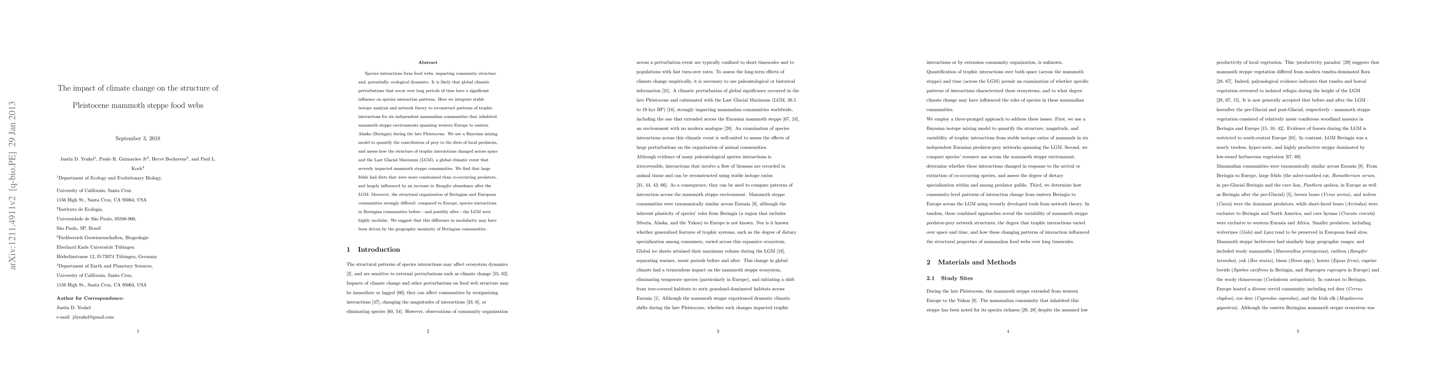 This research paper uses stable isotope analysis and network theory to study the impact of climate change on Pleistocene mammoth steppe food webs in western Europe and eastern Alaska. It found that large felids had diets influenced by an increase in Rangifer abundance after the Last Glacial Maximum, with changes in community structure and modularity driving these shifts.