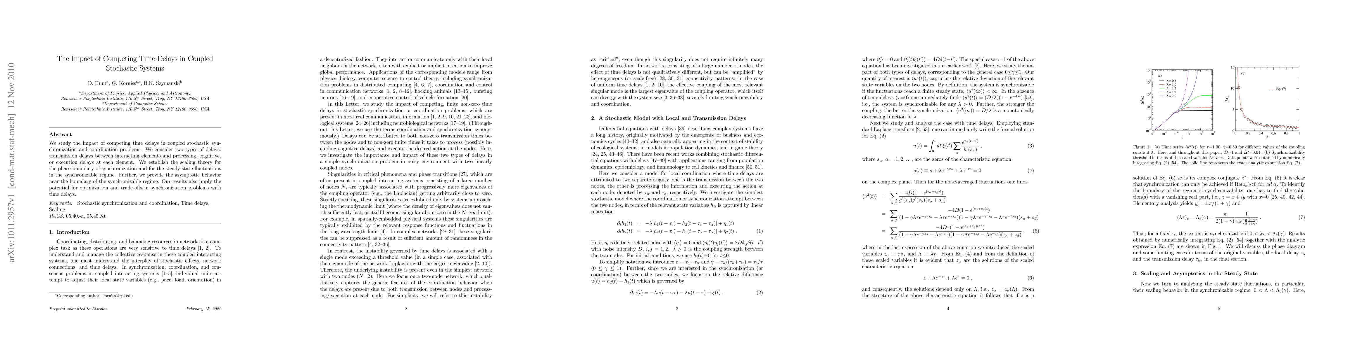 This paper explores the effects of competing time delays in coupled stochastic systems, focusing on synchronization and coordination. It establishes scaling theory for synchronization phase boundaries and steady-state fluctuations, revealing potential optimization and trade-offs in systems with time delays.