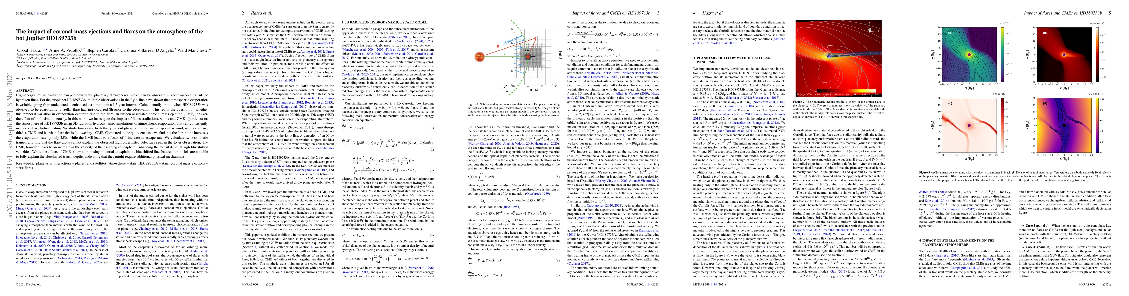 This study investigates the impact of stellar flares, winds, and coronal mass ejections (CMEs) on the atmosphere of HD189733b using 3D simulations. The CME alone significantly increases the atmospheric escape rate, suggesting it may partially explain the observed variable atmospheric evaporation.