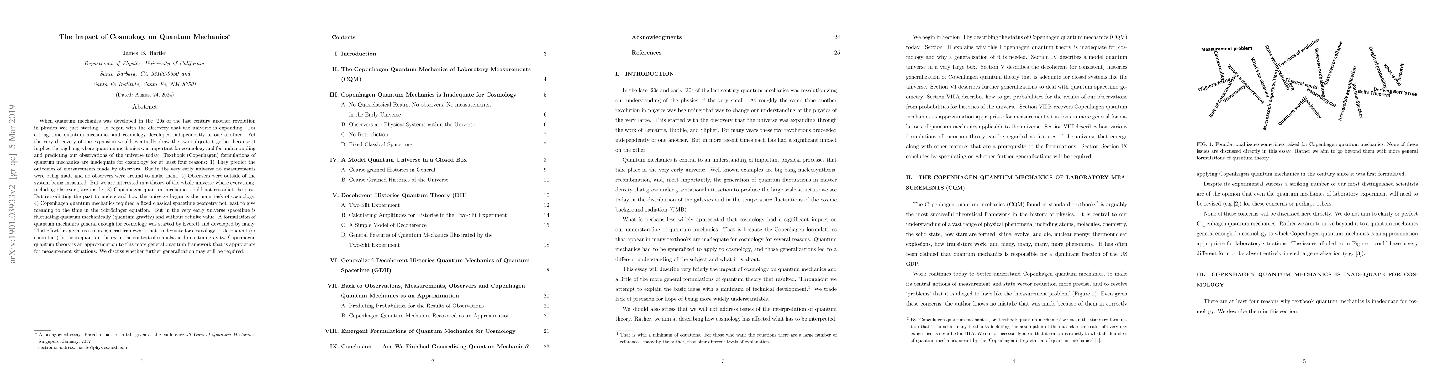 When quantum mechanics was developed in the '20s of the last century another revolution in physics was just starting. It began with the discovery that the universe is expanding. For a long time quantum mechanics and cosmology developed independently of one another. Yet the very discovery of the expansion would eventually draw the two subjects together because it implied the big bang where quantum mechanics wasimportant for cosmology and for understanding and predicting our observations of the universe today. Textbook (Copenhagen) formulations of quantum mechanics are inadequate for cosmology for at least four reasons: 1) They predict the outcomes of measurements made by observers. But in the very early universe no measurements were being made and no observers were around to make them. 2) Observers were outside of the system being measured. But we are interested in a theory of the whole universe where everything, including observers, are inside. 3) Copenhagen quantum mechanics could not retrodict the past. But retrodicting the past to understand how the universe began is the main task of cosmology. 4) Copenhagen quantum mechanics required a fixed classical spacetime geometry not least to give meaning to the time in the Schr\"odinger equation. But in the very early universe spacetime is fluctuating quantum mechanically (quantum gravity) and without definite value. A formulation of quantum mechanics general enough for cosmology was started by Everett and developed by many. That effort has given us a more general framework that is adequate for cosmology --- decoherent (or consistent) histories quantum theory in the context of semiclassical quantum gravity. Copenhagen quantum theory is an approximation to this more general quantum framework that is appropriate for measurement situations. We discuss whether further generalization may still be required.