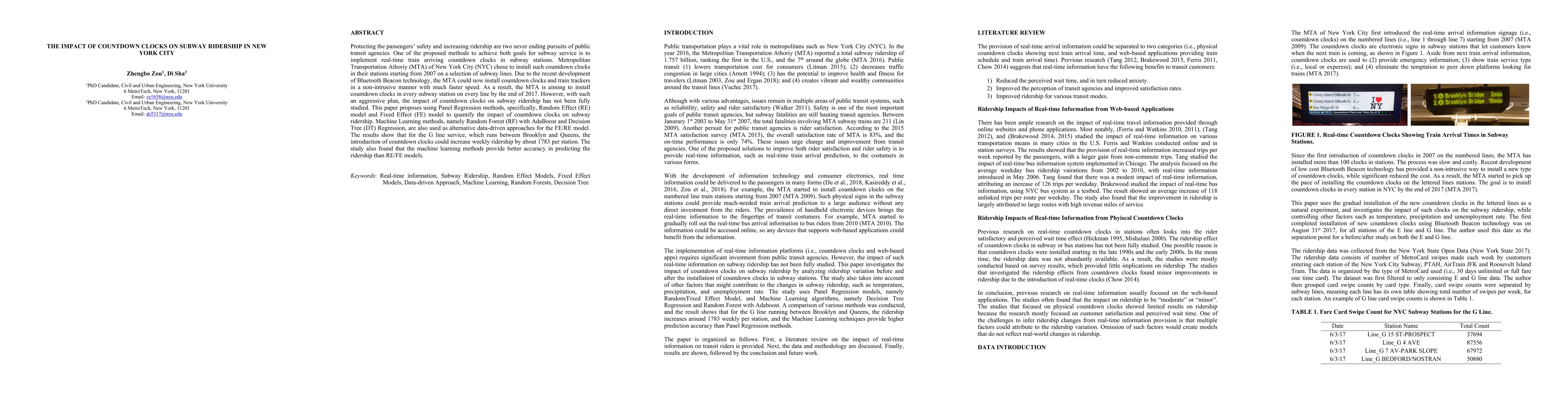 This paper investigates the impact of real-time subway arrival countdown clocks on ridership in New York City's subway system, using Random Effect and Fixed Effect models, alongside machine learning methods like Random Forest and Decision Tree Regression. Results indicate a significant increase in ridership, specifically around 1783 weekly riders per station on the G line, with machine learning methods proving more accurate.