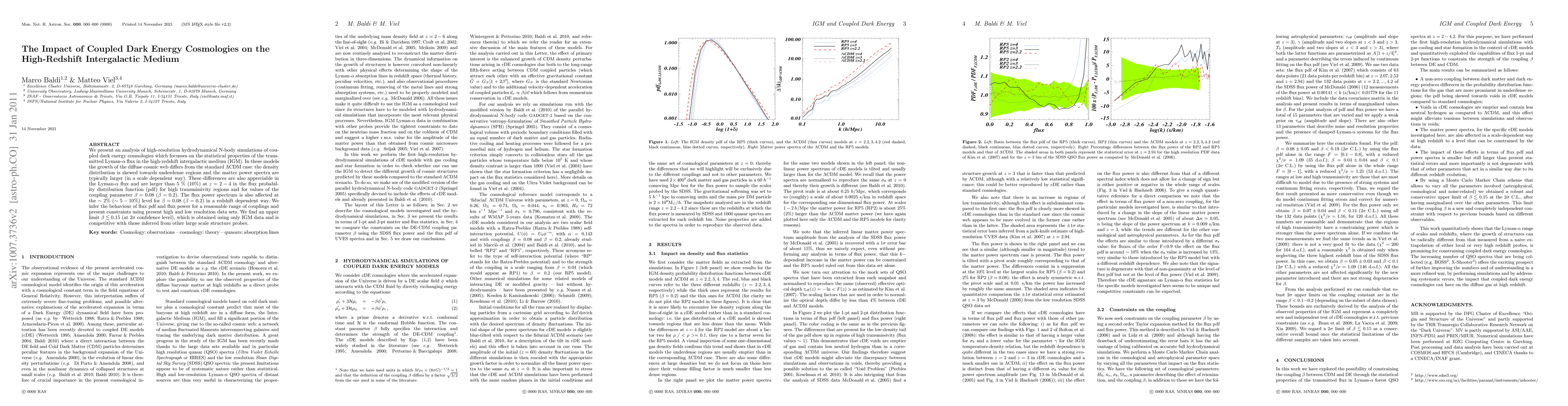 This paper analyzes high-resolution simulations of coupled dark energy cosmologies, finding significant deviations in the statistical properties of the Lyman-alpha flux in the high-redshift IGM compared to standard LCDM models, with differences up to 10% at z=2-4. It sets an upper limit of β < 0.15 for the coupling parameter, competitive with constraints from large scale structure data.