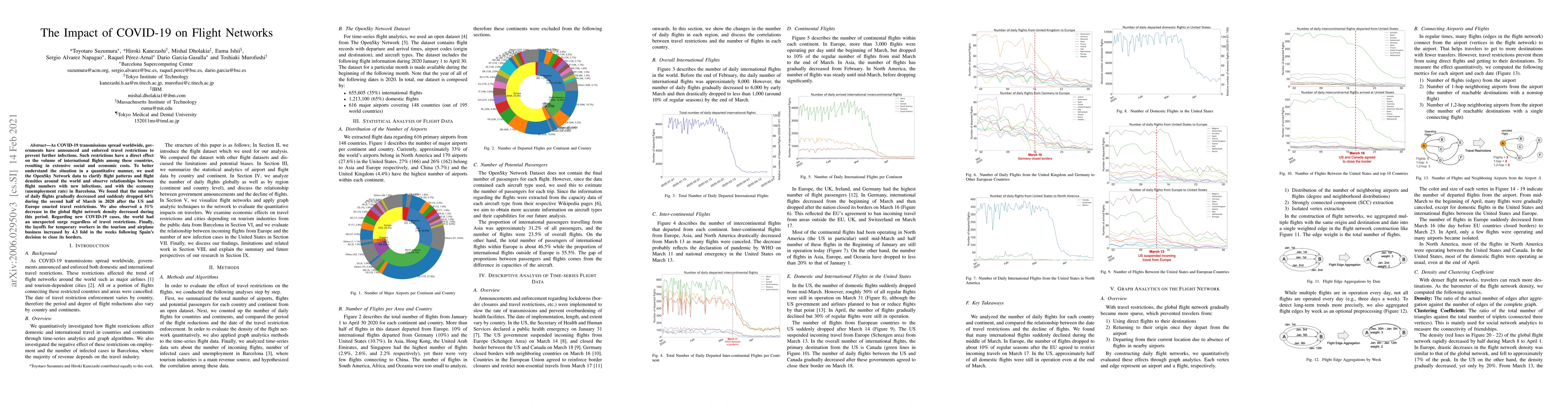 As COVID-19 transmissions spread worldwide, governments have announced and enforced travel restrictions to prevent further infections. Such restrictions have a direct effect on the volume of international flights among these countries, resulting in extensive social and economic costs. To better understand the situation in a quantitative manner, we used the Opensky network data to clarify flight patterns and flight densities around the world and observe relationships between flight numbers with new infections, and with the economy (unemployment rate) in Barcelona. We found that the number of daily flights gradually decreased and suddenly dropped 64% during the second half of March in 2020 after the US and Europe enacted travel restrictions. We also observed a 51% decrease in the global flight network density decreased during this period. Regarding new COVID-19 cases, the world had an unexpected surge regardless of travel restrictions. Finally, the layoffs for temporary workers in the tourism and airplane business increased by 4.3 fold in the weeks following Spain's decision to close its borders.