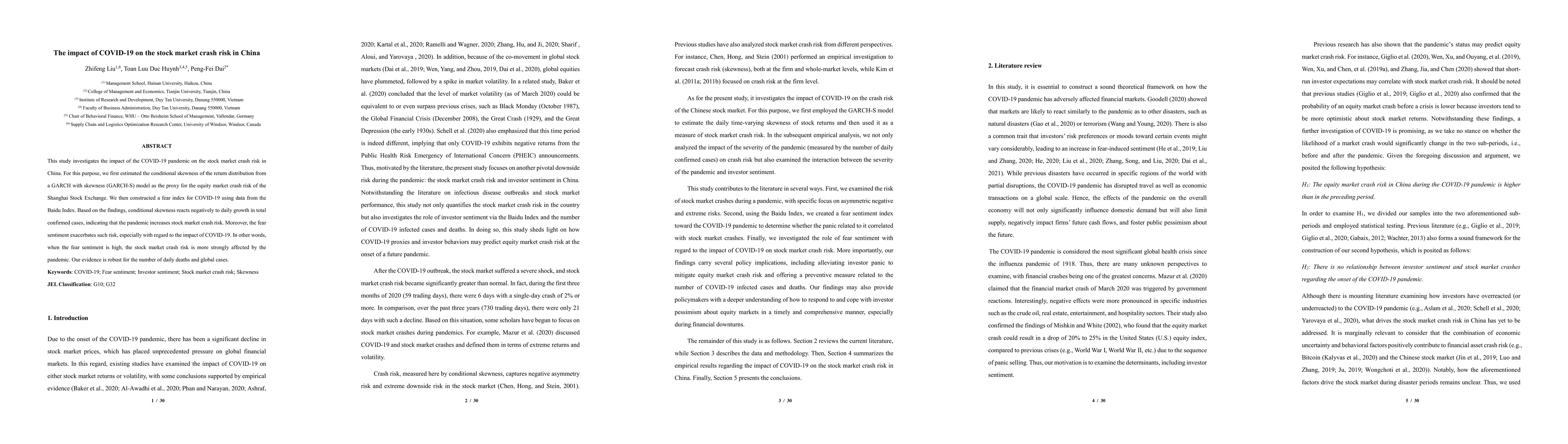 This study finds that the COVID-19 pandemic increases stock market crash risk in China, with higher daily confirmed cases and fear sentiment from the Baidu Index exacerbating this risk. The GARCH-S model shows a negative reaction to rising COVID-19 cases, indicating increased crash risk.