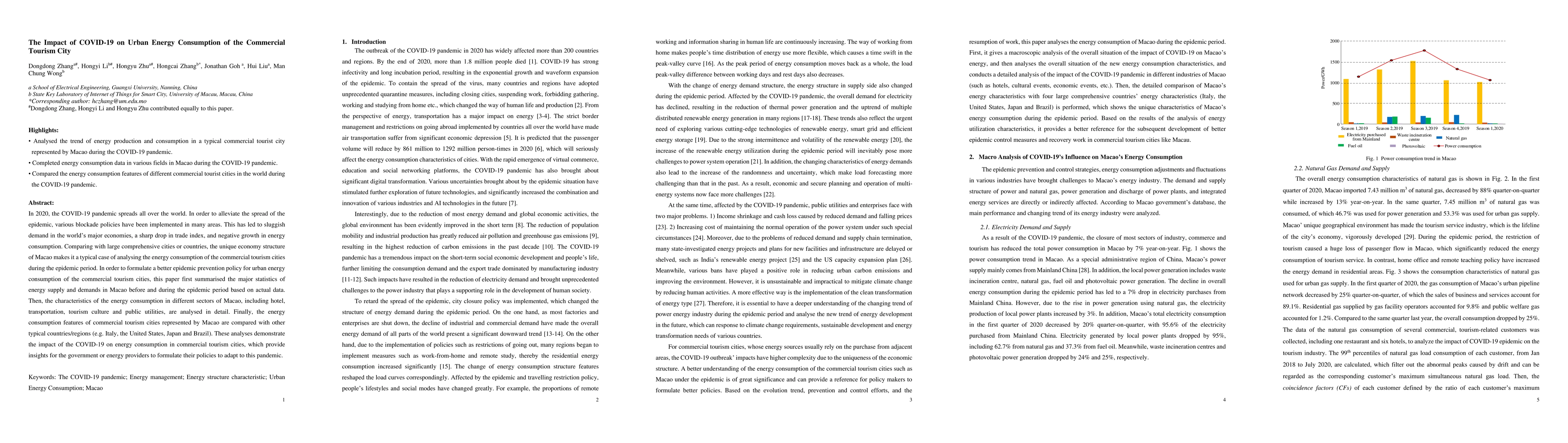 In 2020, the COVID-19 pandemic spreads all over the world. In order to alleviate the spread of the epidemic, various blockade policies have been implemented in many areas. In order to formulate a better epidemic prevention policy for urban energy consumption of the commercial tourism cities, this paper first analyses the energy characteristics of Macao during the epidemic period from two aspects, based on the energy consumption data of Macao. On this basis, the power consumption characteristics of commercial tourism cities during the epidemic were analyzed. Then, this paper provides analysis of the characteristics of the energy consumption in different fields of commercial tourism cities from the aspects of hotel, transportation, tourism culture and public utilities. Finally, a detailed analysis of the energy consumption characteristics of commercial tourism cities represented by Macao during the epidemic period is provided, by comparing with some typical countries.