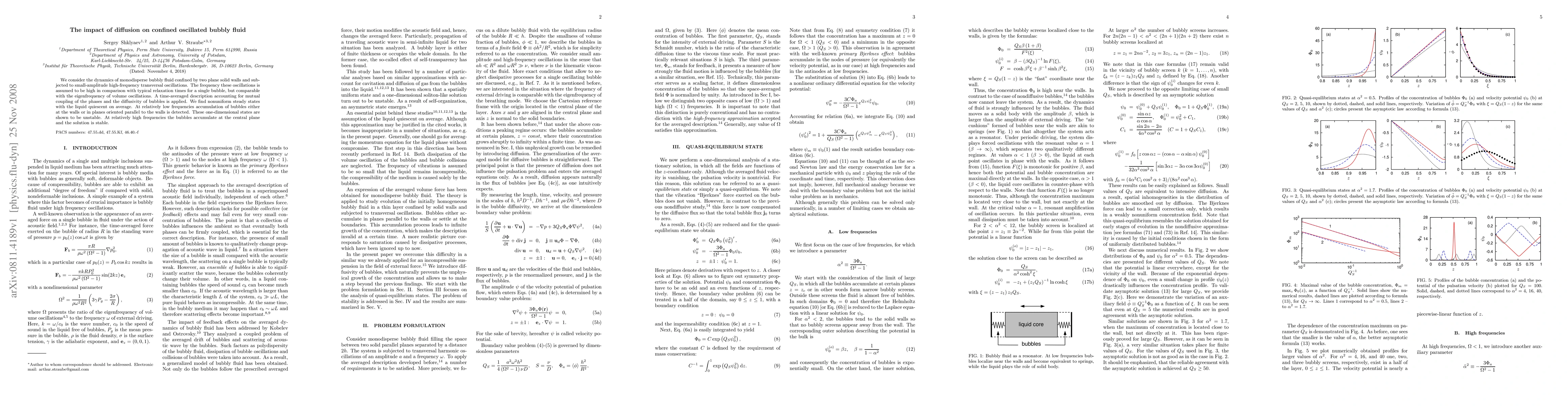 This paper investigates the dynamics of monodisperse bubbly fluid under high-frequency oscillations between solid walls, revealing nonuniform steady states with bubble accumulation at walls or central planes, depending on oscillation frequency, and demonstrating stability at high frequencies.