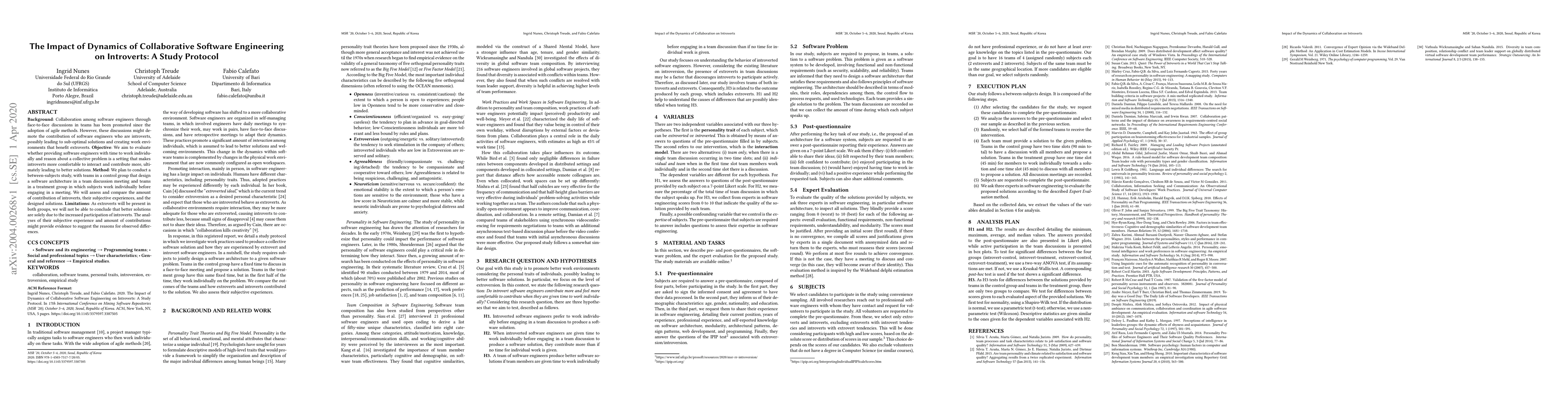 Background: Collaboration among software engineers through face-to-face discussions in teams has been promoted since the adoption of agile methods. However, these discussions might demote the contribution of software engineers who are introverts, possibly leading to sub-optimal solutions and creating work environments that benefit extroverts. Objective: We aim to evaluate whether providing software engineers with time to work individually and reason about a collective problem is a setting that makes introverts more comfortable to interact and contribute more, ultimately leading to better solutions. Method: We plan to conduct a between-subjects study, with teams in a control group that design a software architecture in a team discussion meeting and teams in a treatment group in which subjects work individually before engaging in a meeting. We will assess and compare the amount of contribution of introverts, their subjective experiences, and the designed solutions. Limitations: As extroverts will be present in both groups, we will not be able to conclude that better solutions are solely due to the increased participation of introverts. The analyses of their subjective experience and amount of contributions might provide evidence to suggest the reasons for observed differences.