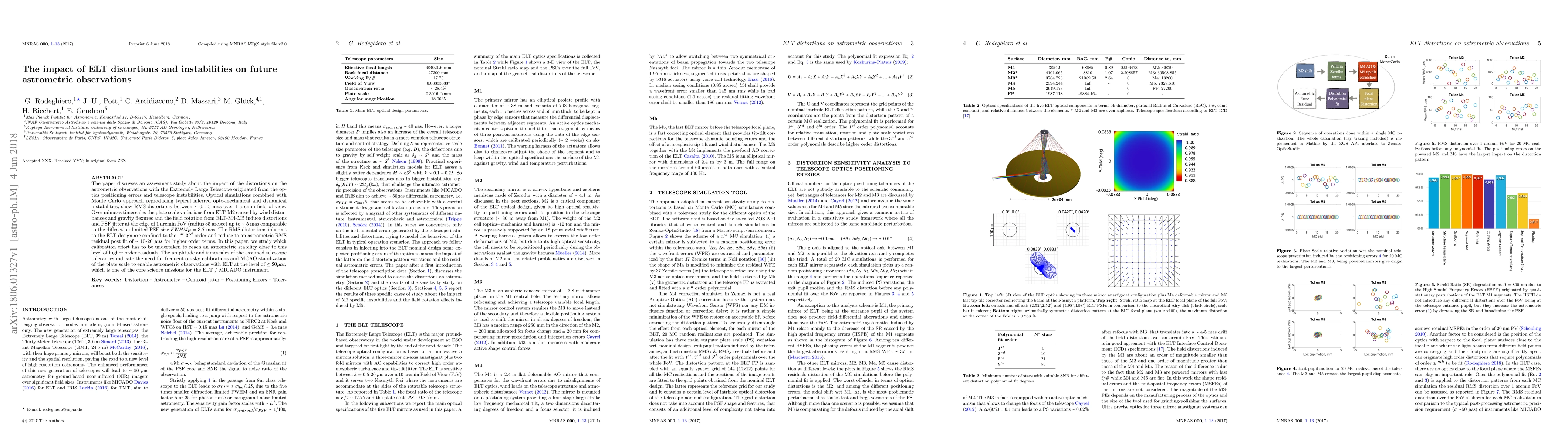 This paper assesses the distortions and instabilities in the Extremely Large Telescope (ELT) that affect astrometric observations, revealing RMS distortions up to 5 mas over a 1 arcmin field of view. It concludes that achieving astrometric stability at the level of 50 μas requires frequent on-sky calibrations and MCAO stabilization due to the telescope's inherent design limitations.