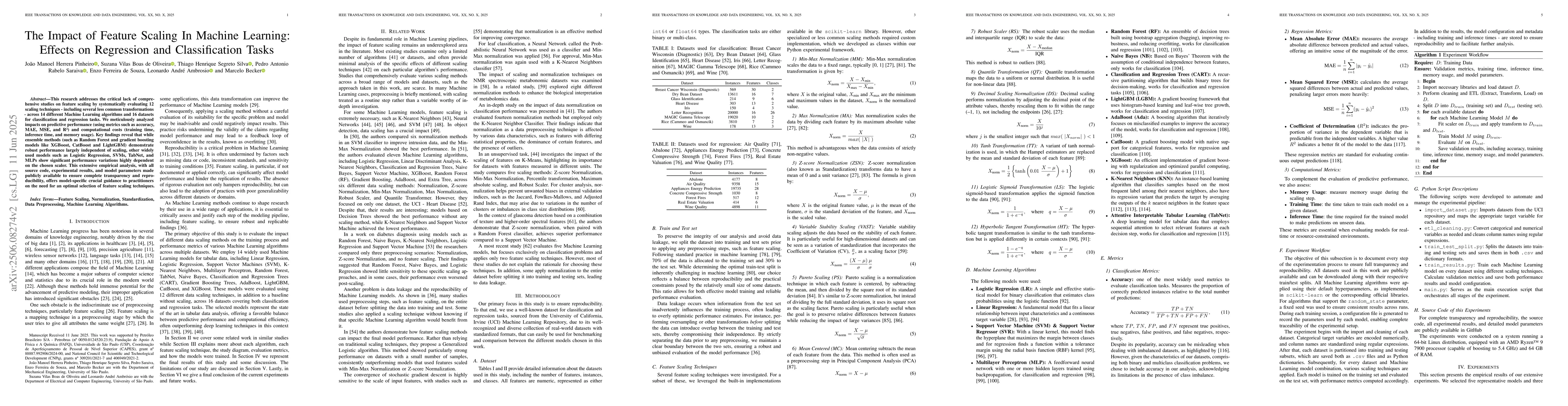 This research addresses the critical lack of comprehensive studies on feature scaling by systematically evaluating 12 scaling techniques - including several less common transformations - across 14 different Machine Learning algorithms and 16 datasets for classification and regression tasks. We meticulously analyzed impacts on predictive performance (using metrics such as accuracy, MAE, MSE, and $R^2$) and computational costs (training time, inference time, and memory usage). Key findings reveal that while ensemble methods (such as Random Forest and gradient boosting models like XGBoost, CatBoost and LightGBM) demonstrate robust performance largely independent of scaling, other widely used models such as Logistic Regression, SVMs, TabNet, and MLPs show significant performance variations highly dependent on the chosen scaler. This extensive empirical analysis, with all source code, experimental results, and model parameters made publicly available to ensure complete transparency and reproducibility, offers model-specific crucial guidance to practitioners on the need for an optimal selection of feature scaling techniques.