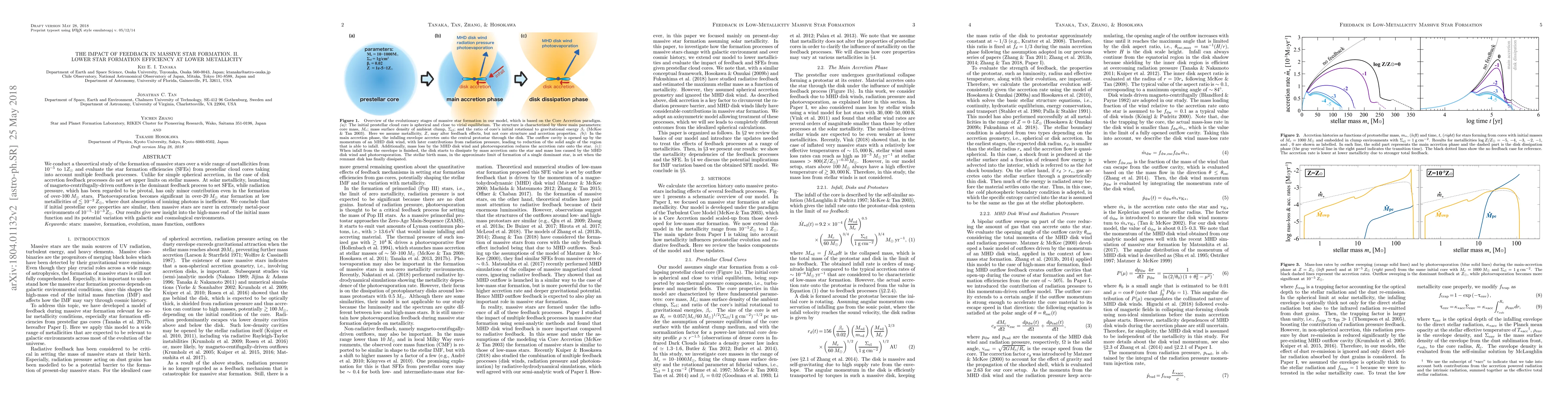This study explores the impact of metallicity on massive star formation efficiency, finding that low metallicity environments significantly reduce star formation efficiency due to inefficient photoevaporation and dust absorption. At solar metallicity, magneto-centrifugally-driven outflows are the main feedback mechanism, while radiation pressure plays a minor role.