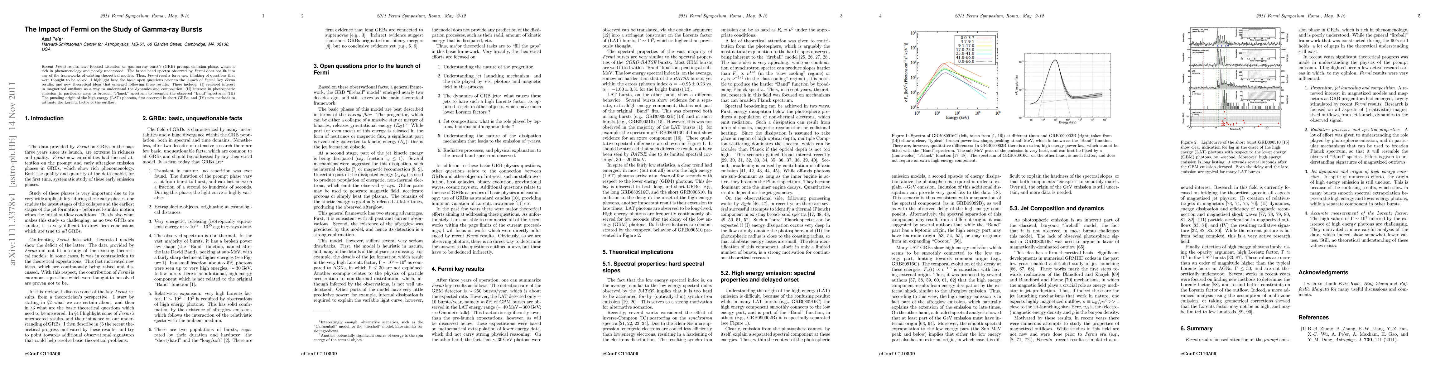 Recent Fermi results have focused attention on gamma-ray burst's (GRB) prompt emission phase, which is rich in phenomenology and poorly understood. The broad band spectra observed by Fermi does not fit into any of the frameworks of existing theoretical models. Thus, Fermi results force new thinking of questions that were thought to be solved. I highlight here the basic open questions prior to the launch of Fermi, key Fermi results, and new theoretical ideas that emerged following these results. These include: (I) renewed interest in magnetized outflows as a way to understand the dynamics and composition; (II) interest in photospheric emission, in particular ways to broaden "Planck" spectrum to resemble the observed "Band" spectrum; (III) The puzzling origin of the high energy (LAT) photons, first observed in short GRBs; and (IV) new methods to estimate the Lorentz factor of the outflow.