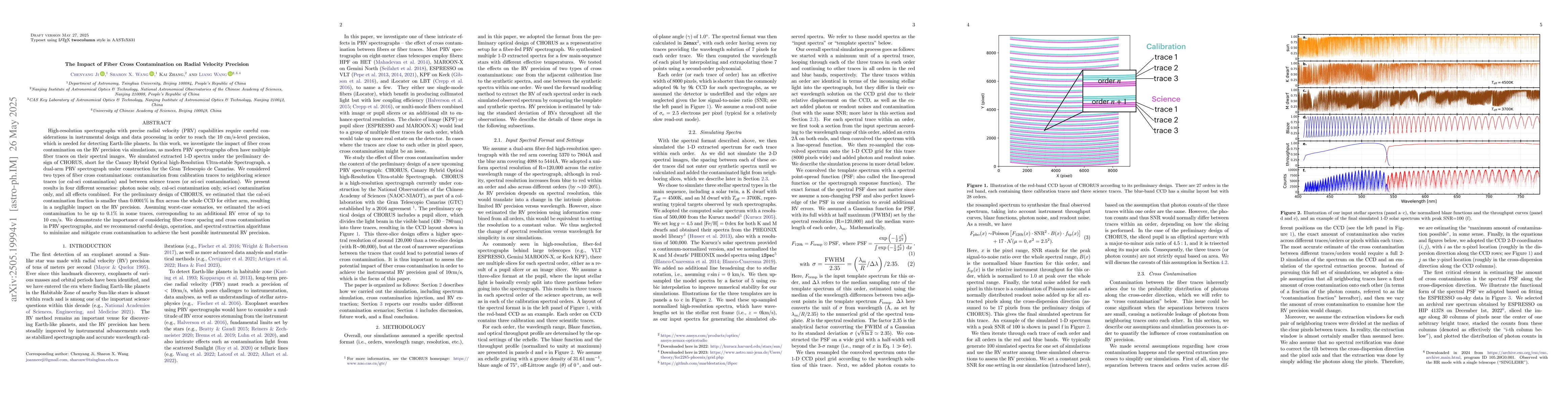 The research investigated the impact of fiber cross contamination on radial velocity (RV) precision using simulations of CHORUS, a dual-arm PRV spectrograph under construction. Two types of contamination were considered: cal-sci (calibration to science) and sci-sci (science to science).