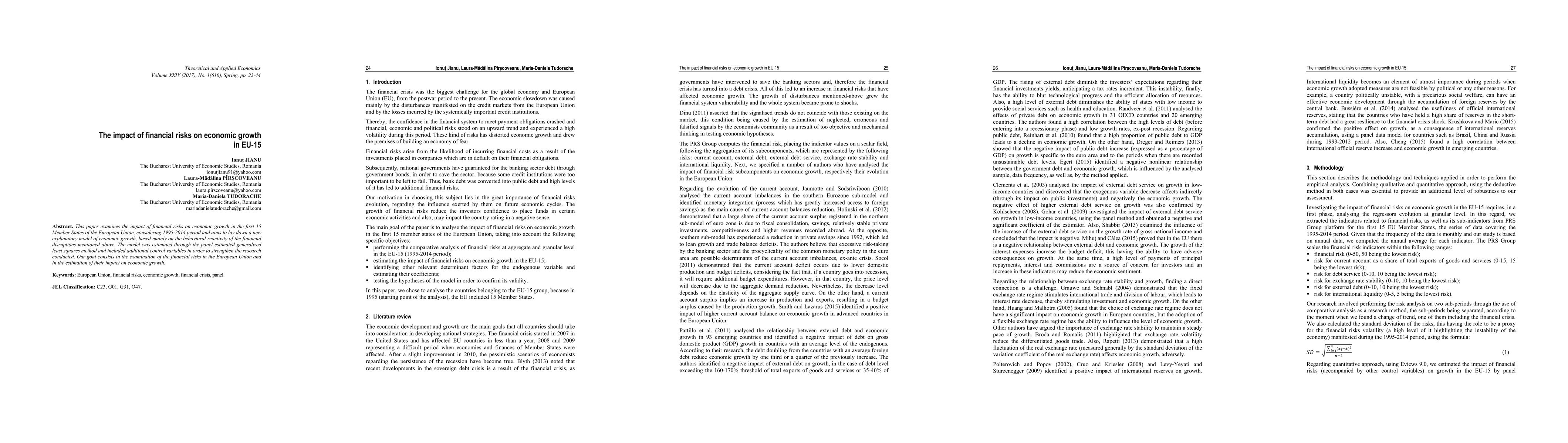 This paper investigates the influence of financial risks on economic growth in the EU-15 from 1995 to 2014, proposing a new explanatory model based on financial disruptions' behavioral reactivity, estimated using panel generalized least squares. The study aims to quantify the financial risks' impact on economic growth.