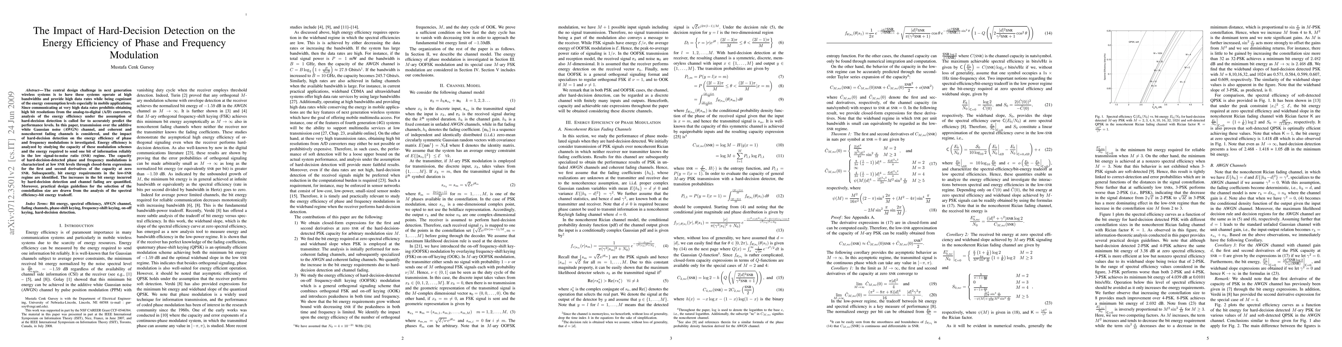 The central design challenge in next generation wireless systems is to have these systems operate at high bandwidths and provide high data rates while being cognizant of the energy consumption levels especially in mobile applications. Since communicating at very high data rates prohibits obtaining high bit resolutions from the analog-to-digital (A/D) converters, analysis of the energy efficiency under the assumption of hard-decision detection is called for to accurately predict the performance levels. In this paper, transmission over the additive white Gaussian noise (AWGN) channel, and coherent and noncoherent fading channels is considered, and the impact of hard-decision detection on the energy efficiency of phase and frequency modulations is investigated. Energy efficiency is analyzed by studying the capacity of these modulation schemes and the energy required to send one bit of information reliably in the low signal-to-noise ratio (SNR) regime. The capacity of hard-decision-detected phase and frequency modulations is characterized at low SNR levels through closed-form expressions for the first and second derivatives of the capacity at zero SNR. Subsequently, bit energy requirements in the low-SNR regime are identified. The increases in the bit energy incurred by hard-decision detection and channel fading are quantified. Moreover, practical design guidelines for the selection of the constellation size are drawn from the analysis of the spectral efficiency--bit energy tradeoff.
