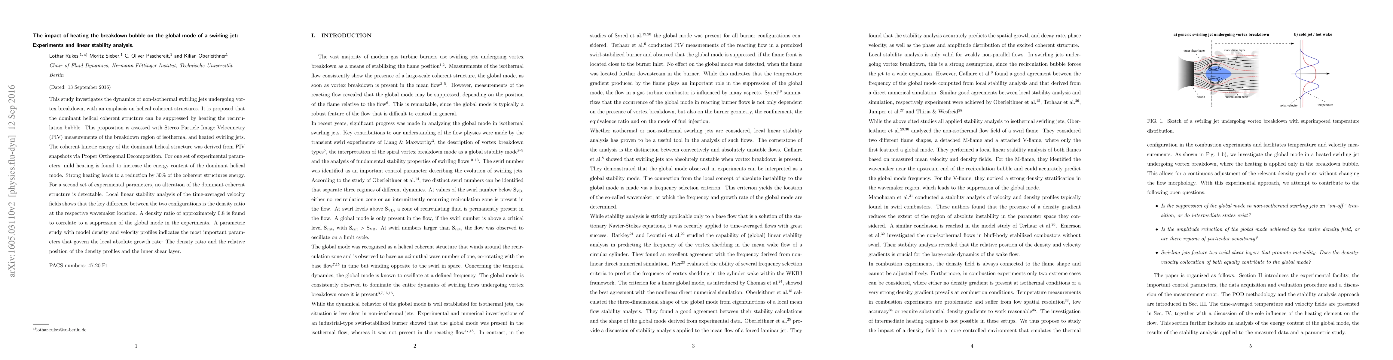 This study investigates the dynamics of non-isothermal swirling jets undergoing vortex breakdown, with an emphasis on helical coherent structures. It is proposed that the dominant helical coherent structure can be suppressed by heating the recirculation bubble. This proposition is assessed with Stereo Particle Image Velocimetry (PIV) measurements of the breakdown region of isothermal and heated swirling jets. The coherent kinetic energy of the dominant helical structure was derived from PIV snapshots via Proper Orthogonal Decomposition. For one set of experimental parameters, mild heating is found to increase the energy content of the dominant helical mode. Strong heating leads to a reduction by 30\% of the coherent structures energy. For a second set of experimental parameters, no alteration of the dominant coherent structure is detectable. Local linear stability analysis of the time-averaged velocity fields shows that the key difference between the two configurations is the density ratio at the respective wavemaker location. A density ratio of approximately 0.8 is found to correlate to a suppression of the global mode in the experiments. A parametric study with model density and velocity profiles indicates the most important parameters that govern the local absolute growth rate: The density ratio and the relative position of the density profiles and the inner shear layer.