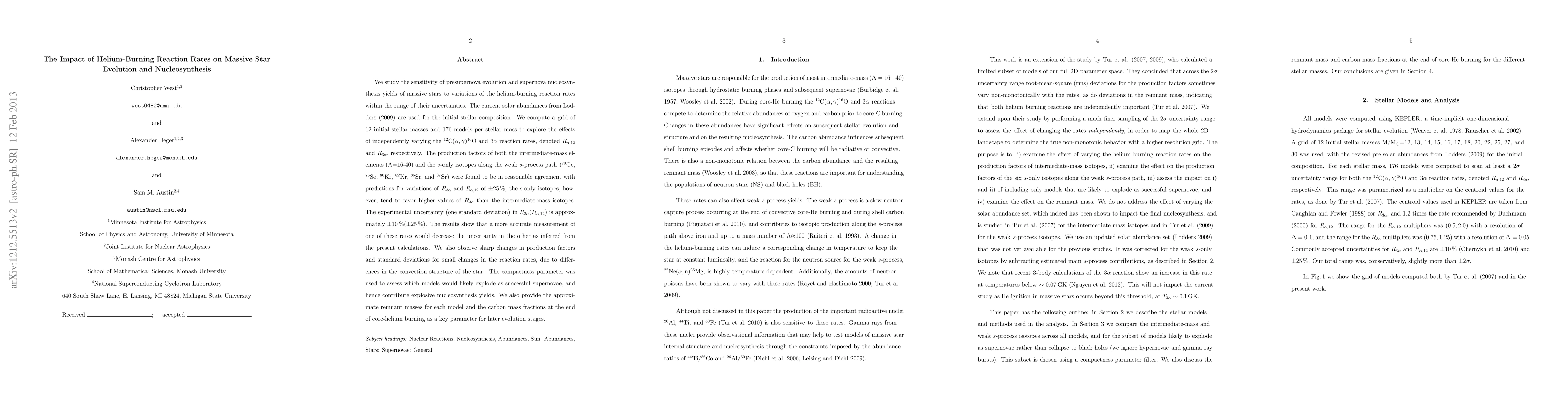 This paper investigates how variations in helium-burning reaction rates affect the evolution and nucleosynthesis of massive stars, finding that small changes in these rates can lead to significant changes in intermediate-mass elements and s-only isotopes production. Accurate measurements of these rates can reduce uncertainties in each other, and the study provides remnant masses and carbon mass fractions for different stellar models.