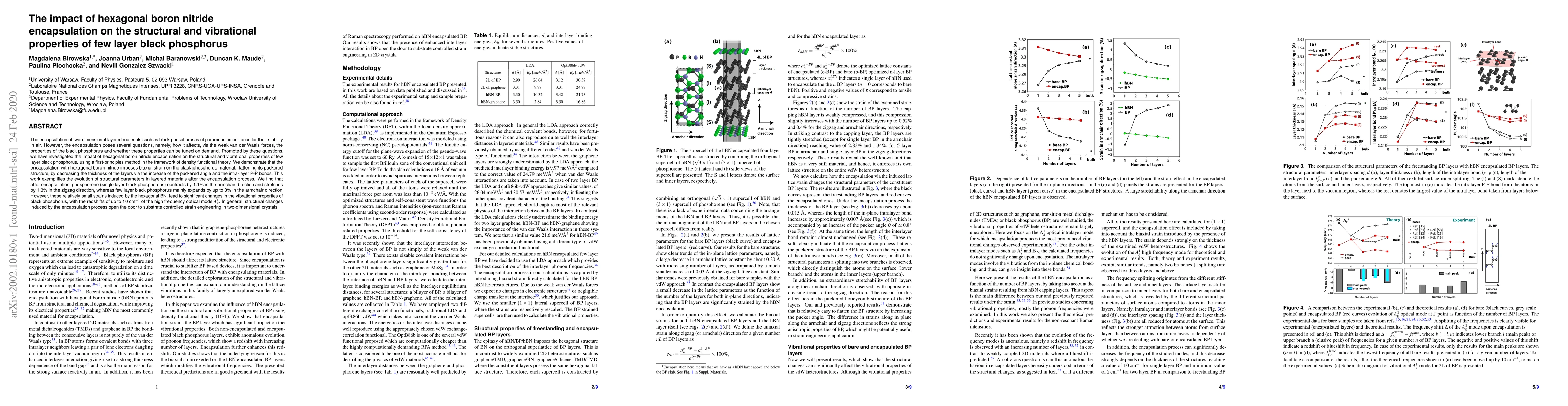 This study investigates the impact of hexagonal boron nitride encapsulation on the structural and vibrational properties of few layer black phosphorus using density functional theory. The encapsulation induces biaxial strain, flattening the black phosphorus structure and altering its vibrational properties, with significant redshifts in the optical mode.
