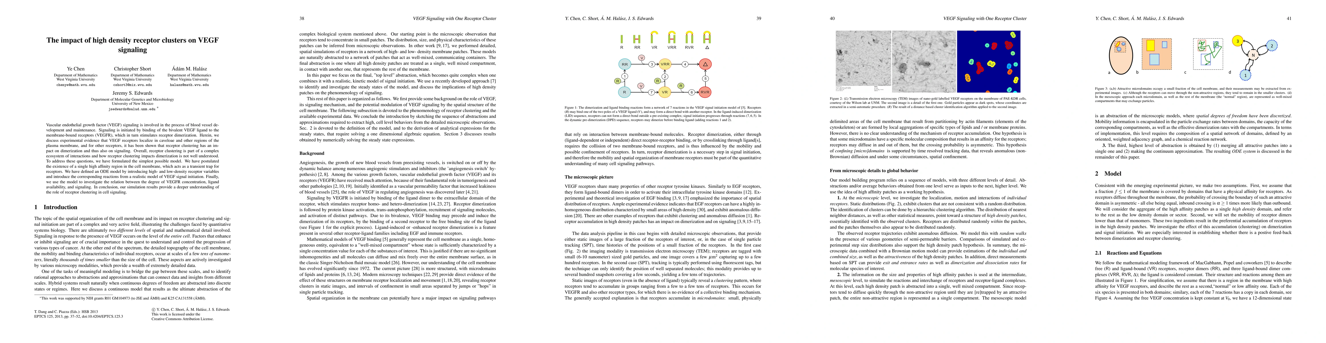 This paper investigates how high-density receptor clusters influence VEGF signaling through receptor dimerization, proposing a model to simulate the interactions and signaling dynamics. The study concludes that receptor clustering significantly impacts signaling, offering insights into the complex mechanisms of VEGF signaling.