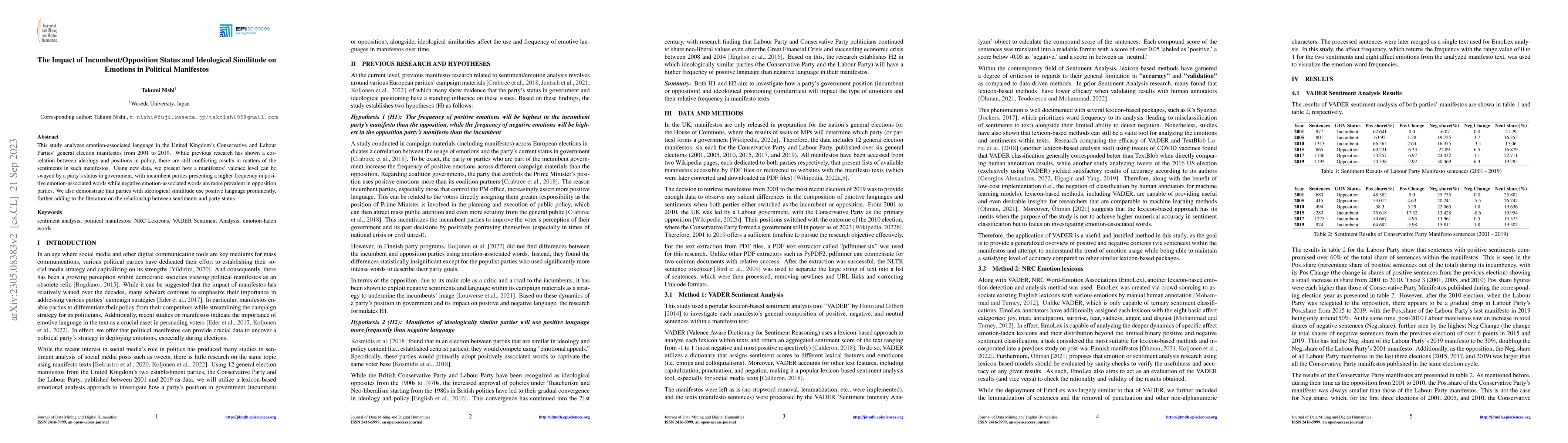 This study analyzes UK Conservative and Labour party manifestos from 2000 to 2019, revealing that incumbent parties use more positive emotion-associated language while opposition parties favor negative language. Additionally, parties with closer ideological alignment tend to employ positive language more frequently.