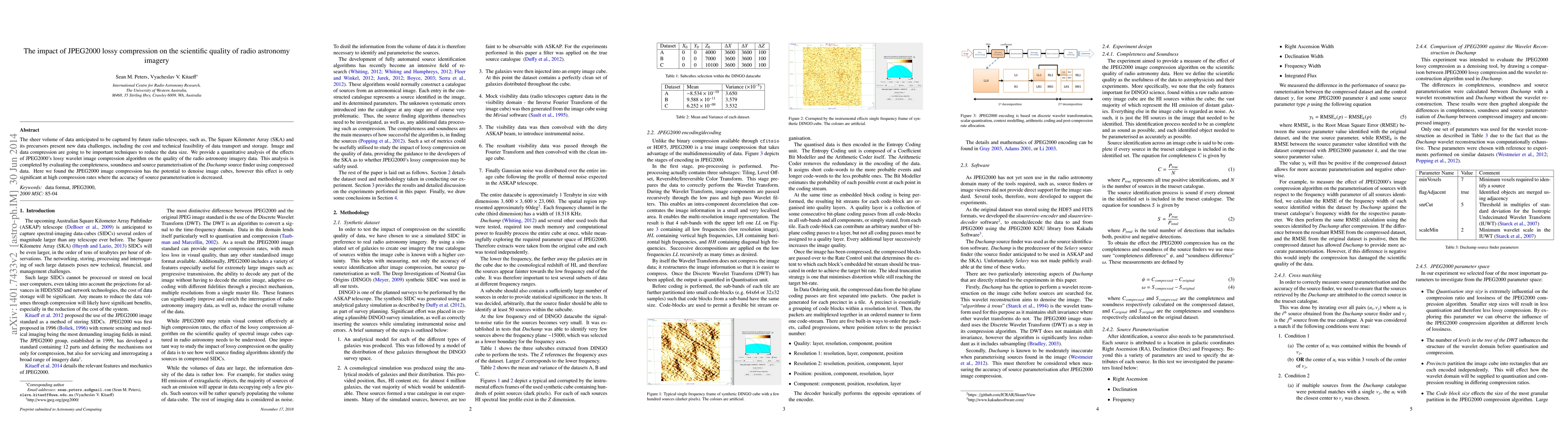 This study quantitatively analyzes the impact of JPEG2000 lossy compression on radio astronomy imagery, finding that while it can denoise image cubes, it significantly reduces the accuracy of source parameterization at high compression rates.