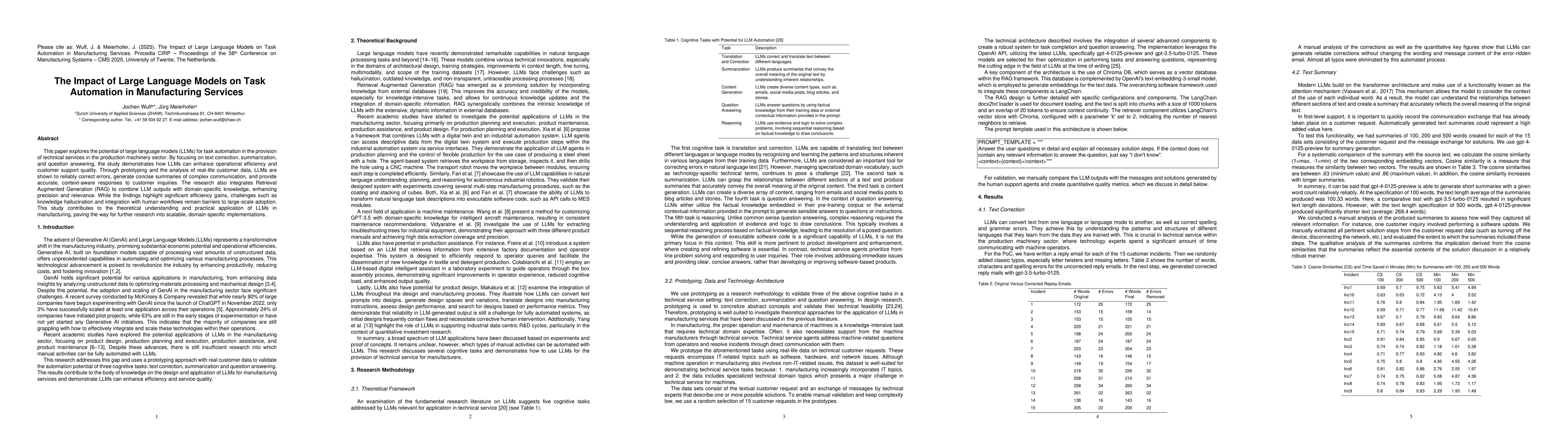 This paper explores the potential of large language models (LLMs) for task automation in the provision of technical services in the production machinery sector. By focusing on text correction, summarization, and question answering, the study demonstrates how LLMs can enhance operational efficiency and customer support quality. Through prototyping and the analysis of real-life customer data, LLMs are shown to reliably correct errors, generate concise summaries of complex communication, and provide accurate, context-aware responses to customer inquiries. The research also integrates Retrieval Augmented Generation (RAG) to combine LLM outputs with domain-specific knowledge, enhancing precision and relevance. While the findings highlight significant efficiency gains, challenges such as knowledge hallucination and integration with human workflows remain barriers to large-scale adoption. This study contributes to the theoretical understanding and practical application of LLMs in manufacturing, paving the way for further research into scalable, domain-specific implementations.