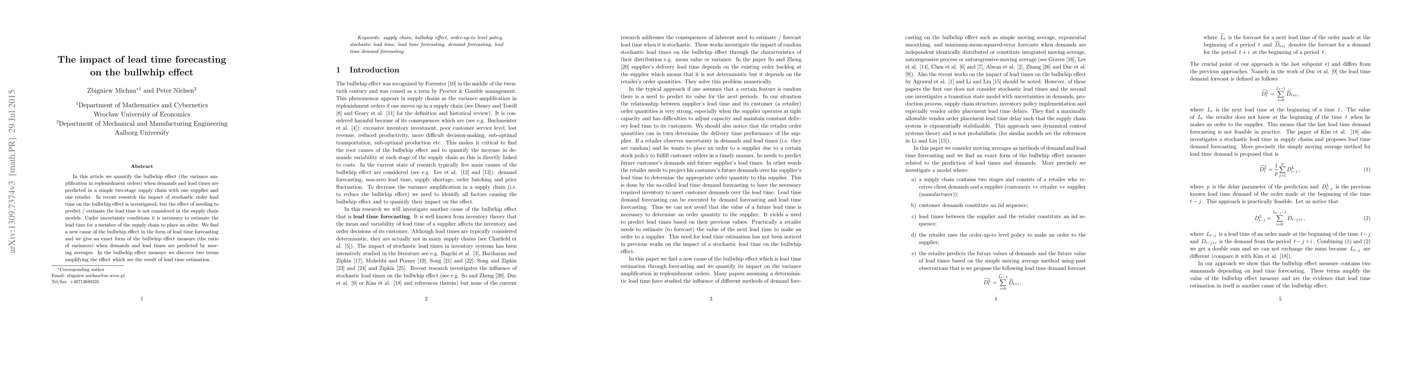 This paper investigates how lead time forecasting contributes to the bullwhip effect in a two-stage supply chain, revealing that estimating lead times under uncertainty can amplify variance in replenishment orders. The study provides an exact bullwhip effect measure, showing two terms that emerge from lead time estimation, thus identifying a new cause of the bullwhip effect.