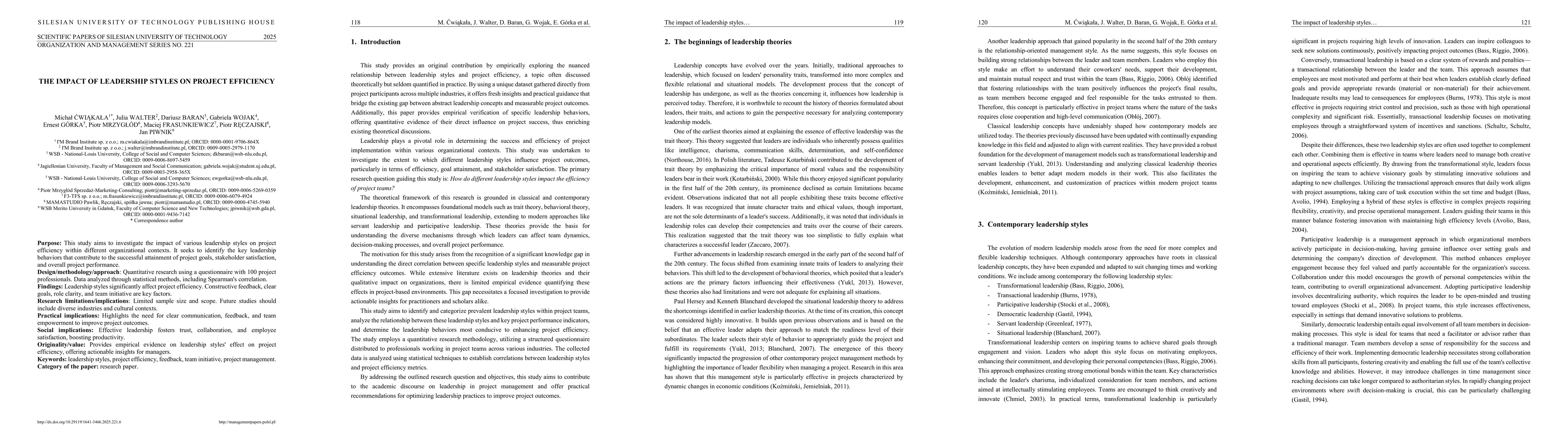 This work uniquely applies leadership theory to project management contexts, identifying specific behaviors that directly influence project efficiency and offering practical recommendations for improvement.