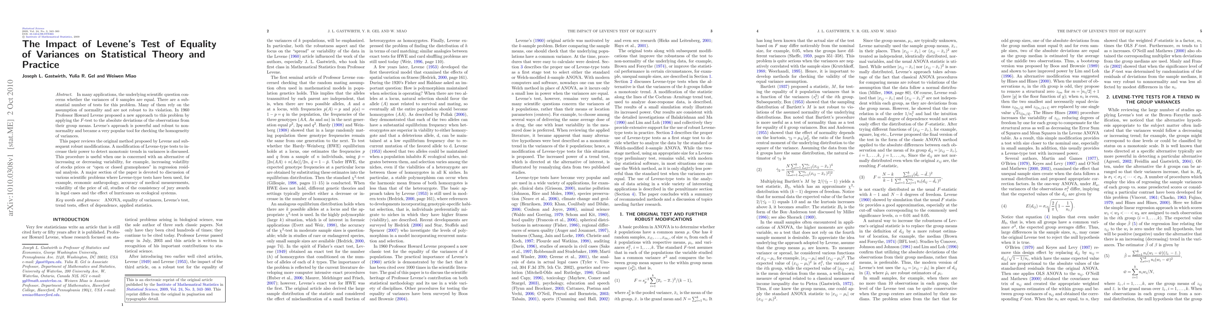 In many applications, the underlying scientific question concerns whether the variances of $k$ samples are equal. There are a substantial number of tests for this problem. Many of them rely on the assumption of normality and are not robust to its violation. In 1960 Professor Howard Levene proposed a new approach to this problem by applying the $F$-test to the absolute deviations of the observations from their group means. Levene's approach is powerful and robust to nonnormality and became a very popular tool for checking the homogeneity of variances. This paper reviews the original method proposed by Levene and subsequent robust modifications. A modification of Levene-type tests to increase their power to detect monotonic trends in variances is discussed. This procedure is useful when one is concerned with an alternative of increasing or decreasing variability, for example, increasing volatility of stocks prices or "open or closed gramophones" in regression residual analysis. A major section of the paper is devoted to discussion of various scientific problems where Levene-type tests have been used, for example, economic anthropology, accuracy of medical measurements, volatility of the price of oil, studies of the consistency of jury awards in legal cases and the effect of hurricanes on ecological systems.