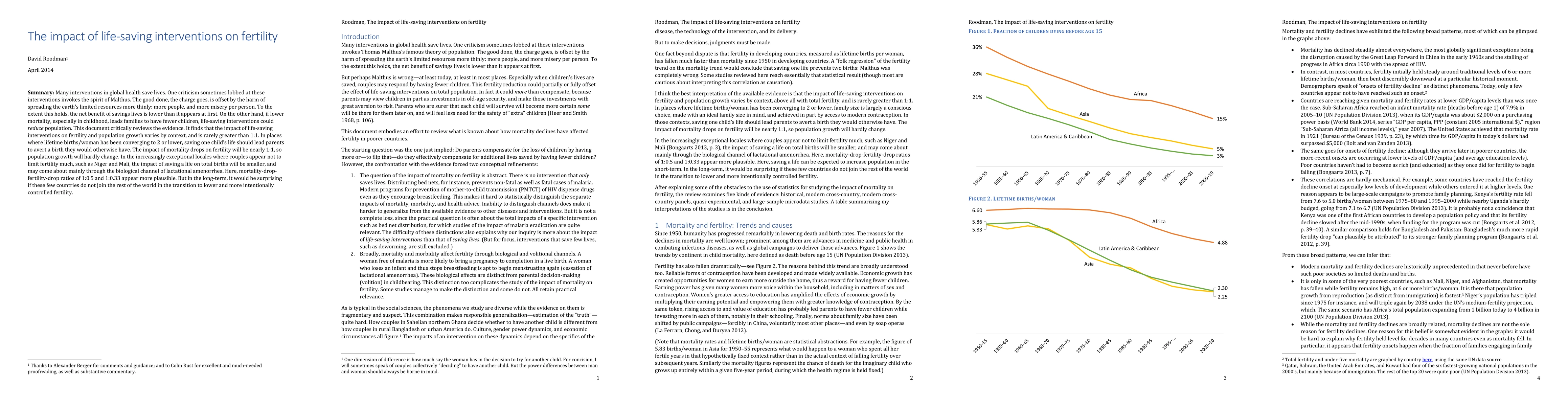 The research examines the effect of life-saving interventions on fertility, finding that their impact varies by context. Generally, the reduction in fertility due to such interventions is almost equal to the number of lives saved, with exceptions like Niger and Mali showing a smaller impact. The paper suggests that over time, most regions will likely transition to lower fertility rates.