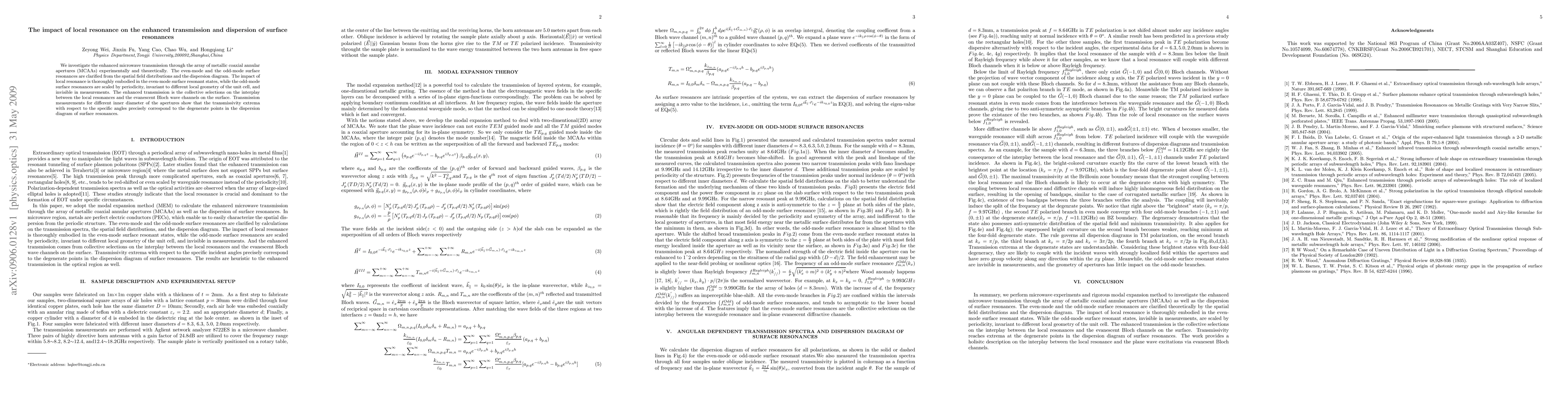 We investigate the enhanced microwave transmission through the array of metallic coaxial annular apertures (MCAAs) experimentally and theoretically. The even-mode and the odd-mode surface resonances are clarified from the spatial field distributions and the dispersion diagram. The impact of local resonance is thoroughly embodied in the even-mode surface resonant states, while the odd-mode surface resonances are scaled by periodicity, invariant to different local geometry of the unit cell, and invisible in measurements. The enhanced transmission is the collective selections on the interplay between the local resonances and the evanescent Bloch wave channels on the surface. Transmission measurements for different inner diameter of the apertures show that the transmissivity extrema with respect to the specific angles precisely correspond to the degenerate points in the dispersion diagram of surface resonances.