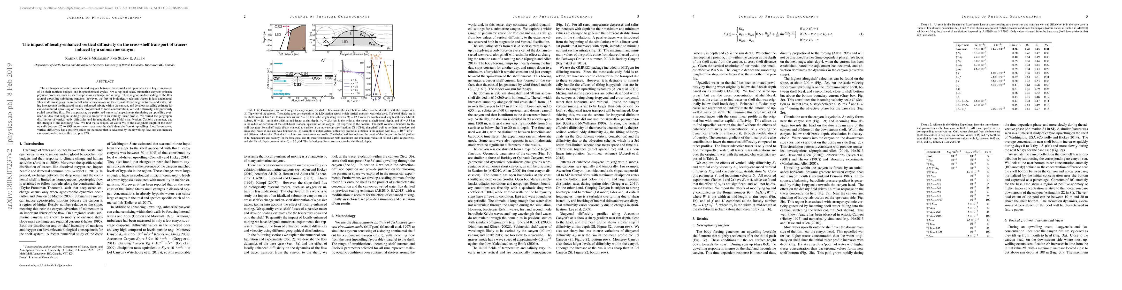 This study investigates the influence of submarine canyons on cross-shelf tracer transport, emphasizing locally-enhanced vertical diffusivity. Numerical simulations reveal that canyons can upwell 25-89% more tracer mass compared to coastal upwelling, with enhanced vertical diffusivity increasing tracer flux by up to 27%.