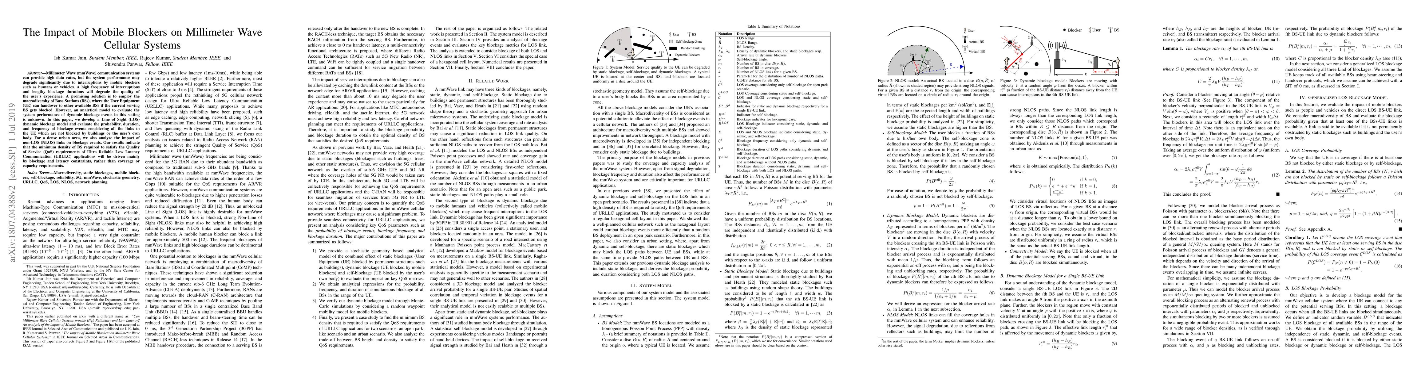 This paper develops a Line of Sight dynamic blockage model to evaluate the impact of mobile blockers on millimeter wave cellular systems, showing that macrodiversity through Base Stations can mitigate performance degradation. The study finds that the minimum density of Base Stations needed to meet Ultra Reliable Low Latency Communication requirements is primarily influenced by blockage and latency, rather than coverage or capacity.