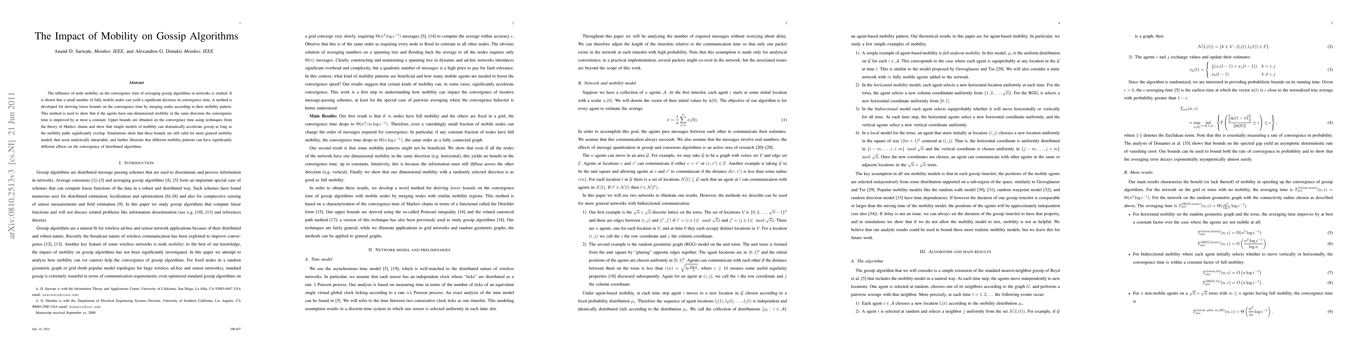 The influence of node mobility on the convergence time of averaging gossip algorithms in networks is studied. It is shown that a small number of fully mobile nodes can yield a significant decrease in convergence time. A method is developed for deriving lower bounds on the convergence time by merging nodes according to their mobility pattern. This method is used to show that if the agents have one-dimensional mobility in the same direction the convergence time is improved by at most a constant. Upper bounds are obtained on the convergence time using techniques from the theory of Markov chains and show that simple models of mobility can dramatically accelerate gossip as long as the mobility paths significantly overlap. Simulations verify that different mobility patterns can have significantly different effects on the convergence of distributed algorithms.