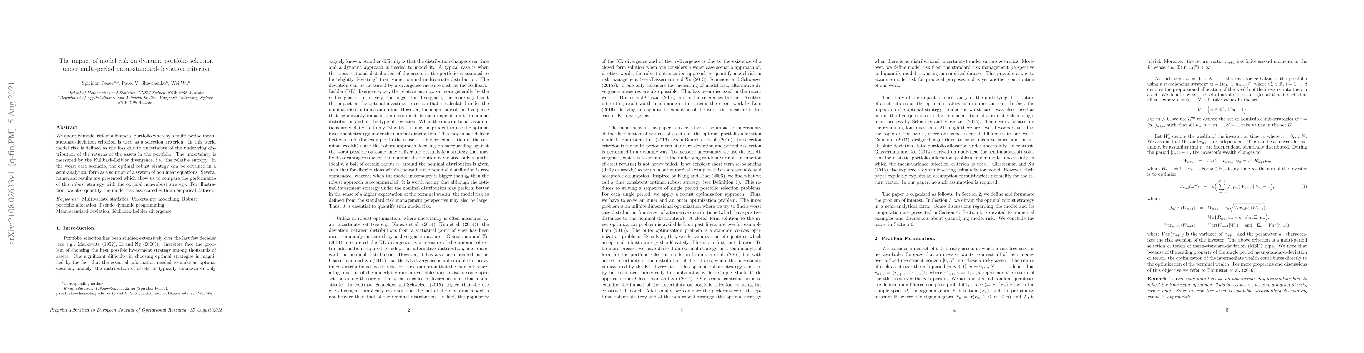 This paper quantifies model risk in dynamic portfolio selection using a multi-period mean-standard-deviation criterion, measuring uncertainty through Kullback-Leibler divergence. It presents a robust strategy derived from a system of nonlinear equations and compares its performance against a non-robust strategy, demonstrating the impact of model risk with empirical data.