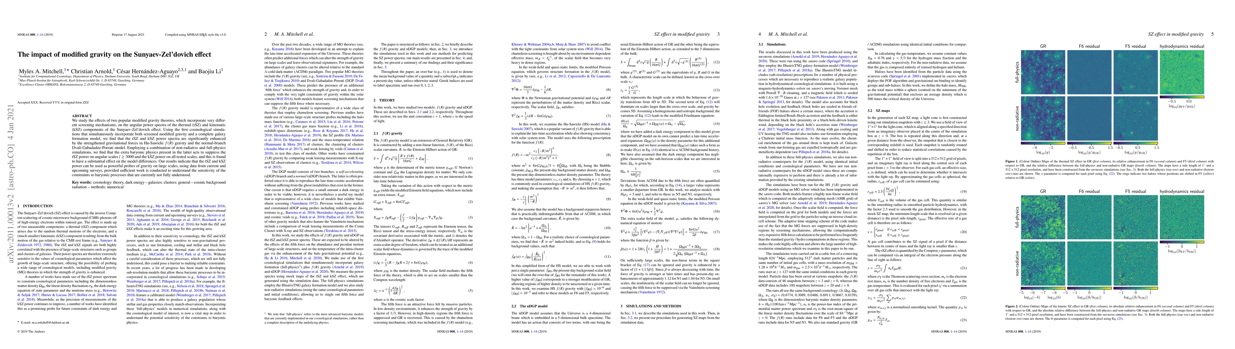Modified gravity theories enhance Sunyaev-Zel'dovich effect power spectra, but baryonic physics can suppress them on large scales, providing a new probe for testing gravity on large scales.