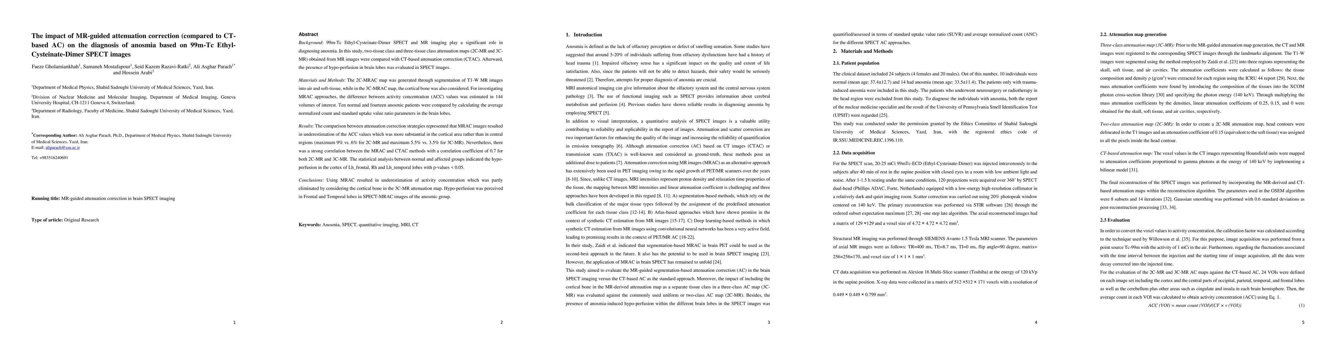 This study compares MR-guided attenuation correction (MRAC) to CT-based attenuation correction (CTAC) in diagnosing anosmia using 99m-Tc EthylCysteinate-Dimer SPECT images, finding that MRAC underestimates activity concentration more in cortical areas but maintains strong correlation with CTAC. Hypoperfusion in frontal and temporal lobes was detected in anosmic patients using MRAC.