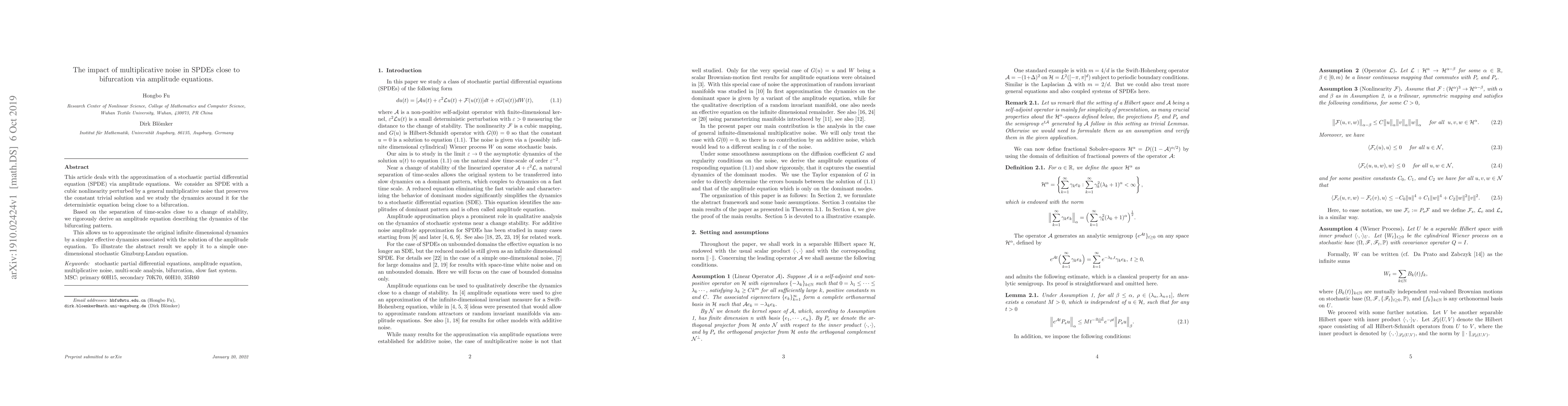 This paper develops an amplitude equation to approximate a stochastic partial differential equation near a bifurcation point, providing a simplified model for dynamics.