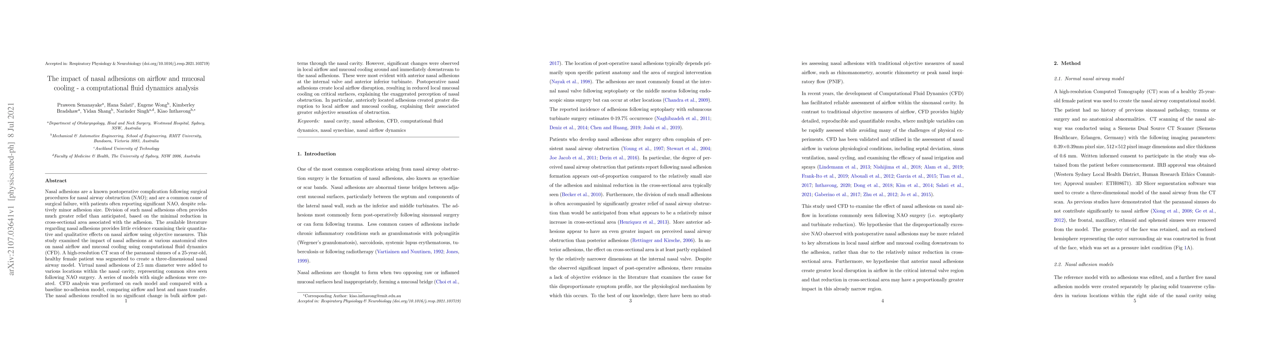 This study used computational fluid dynamics to analyze the impact of nasal adhesions on nasal airflow and mucosal cooling. It found that while adhesions did not significantly alter overall airflow, they caused notable changes in local airflow patterns and mucosal cooling, particularly at the internal nasal valve and anterior inferior turbinate.