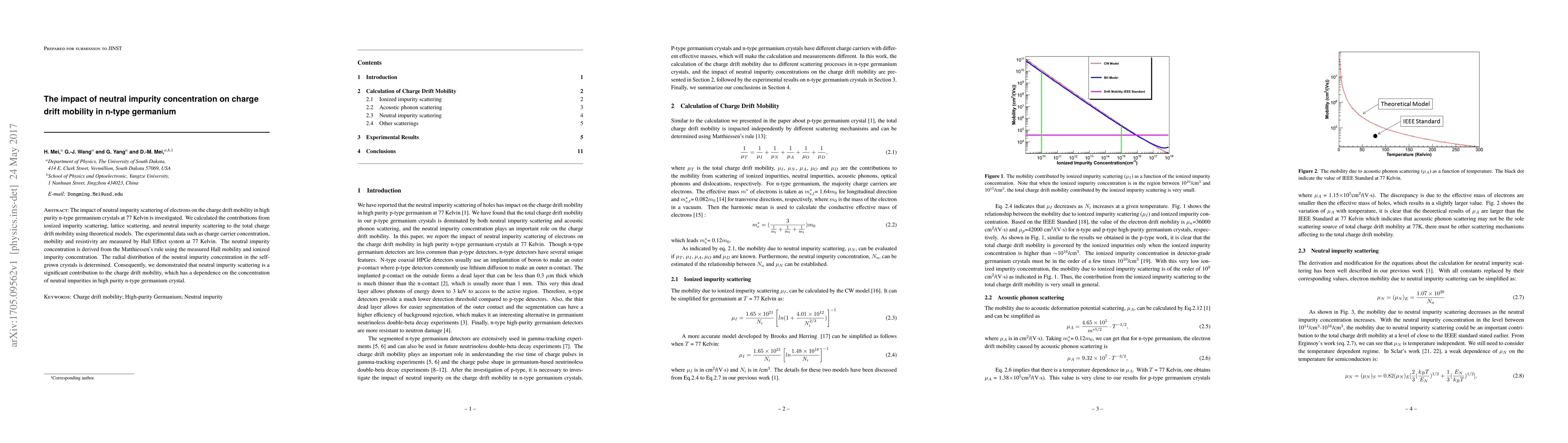 The impact of neutral impurity scattering of electrons on the charge drift mobility in high purity n-type germanium crystals at 77 Kelvin is investigated. We calculated the contributions from ionized impurity scattering, lattice scattering, and neutral impurity scattering to the total charge drift mobility using theoretical models. The experimental data such as charge carrier concentration, mobility and resistivity are measured by Hall Effect system at 77 Kelvin. The neutral impurity concentration is derived from the Matthiessen's rule using the measured Hall mobility and ionized impurity concentration. The radial distribution of the neutral impurity concentration in the self-grown crystals is determined. Consequently, we demonstrated that neutral impurity scattering is a significant contribution to the charge drift mobility, which has a dependence on the concentration of neutral impurities in high purity n-type germanium crystal.