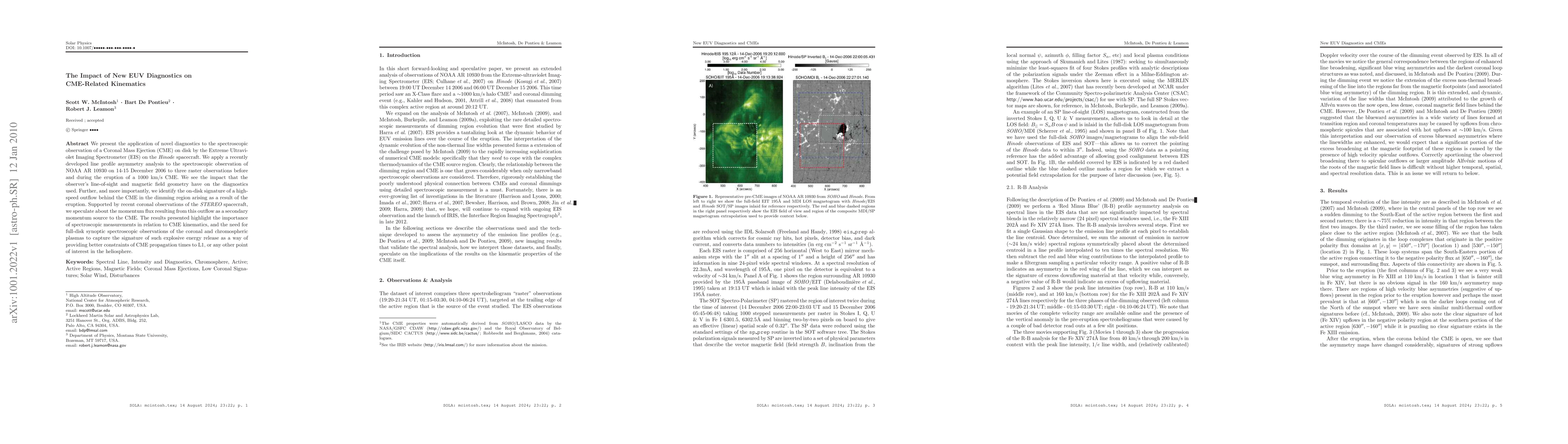 This paper utilizes new EUV diagnostics to analyze the kinematics of a Coronal Mass Ejection (CME) observed by the Hinode spacecraft, revealing the impact of line-of-sight and magnetic field geometry on diagnostics. It identifies a high-speed outflow behind the CME, suggesting it as a secondary momentum source, and emphasizes the importance of spectroscopic measurements for better CME propagation predictions.