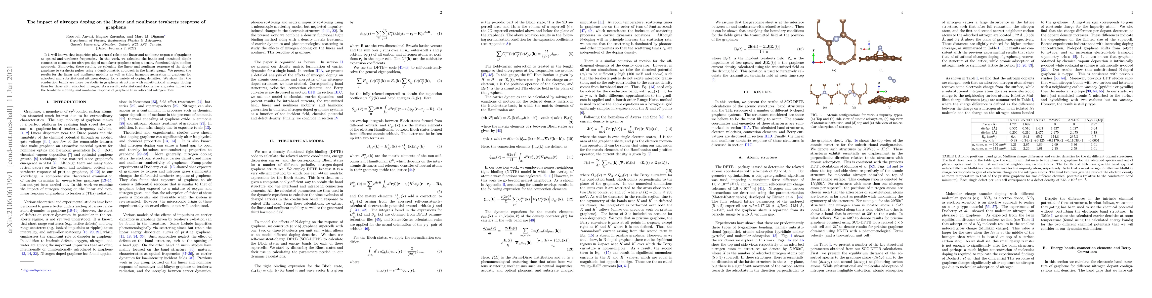 It is well known that impurities play a central role in the linear and nonlinear response of graphene at optical and terahertz frequencies. In this work, we calculate the bands and intraband dipole connection elements for nitrogen-doped monolayer graphene using a density functional tight binding approach. Employing these results, we calculate the linear and nonlinear response of the doped graphene to terahertz pulses using a density-matrix approach in the length gauge. We present the results for the linear and nonlinear mobility as well as third harmonic generation in graphene for adsorbed and substitutional nitrogen doping for a variety of doping densities. We show that the conduction bands are more parabolic in graphene structures with substitutional nitrogen doping than for those with adsorbed nitrogen. As a result, substitutional doping has a greater impact on the terahertz mobility and nonlinear response of graphene than adsorbed nitrogen does.