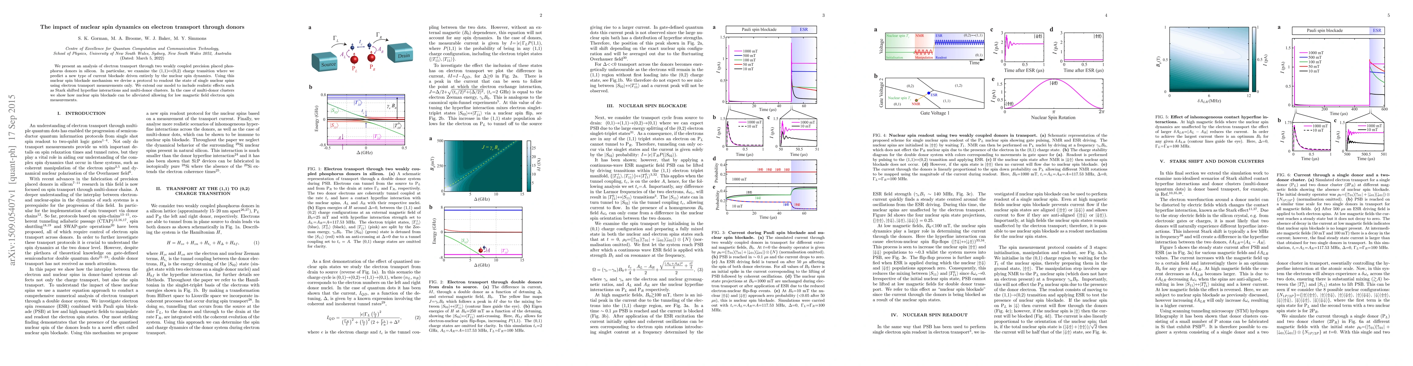 We present an analysis of electron transport through two weakly coupled precision placed phosphorus donors in silicon. In particular, we examine the (1,1) to (0,2) charge transition where we predict a new type of current blockade driven entirely by the nuclear spin dynamics. Using this nuclear spin blockade mechanism we devise a protocol to readout the state of single nuclear spins using electron transport measurements only. We extend our model to include realistic effects such as Stark shifted hyperfine interactions and multi-donor clusters. In the case of multi-donor clusters we show how nuclear spin blockade can be alleviated allowing for low magnetic field electron spin measurements.